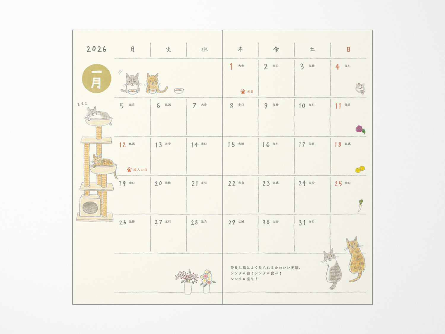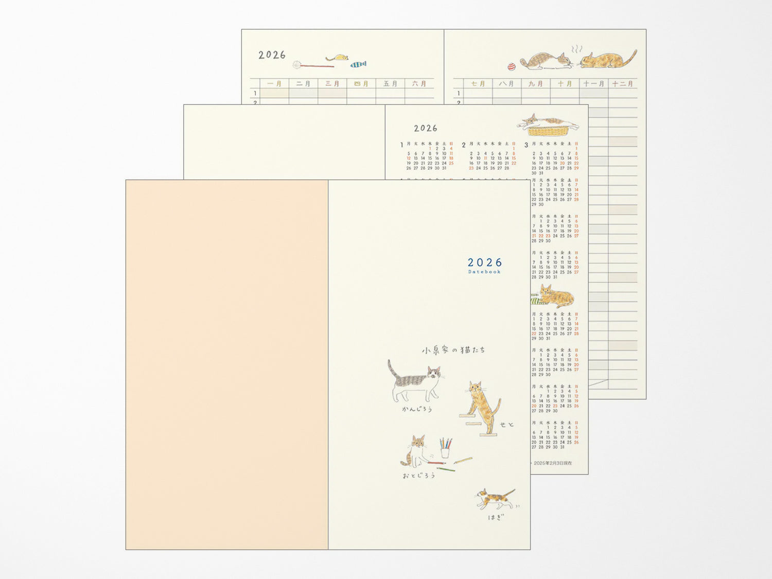 The Midori 2026 Pocket Diary Slim - Cat is a pocket-sized diary with a monthly layout, dated January 2026 – March 2027. The pages feature charming cat illustrations by Sayo Koizumi.