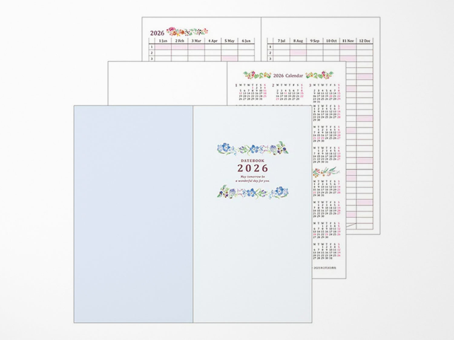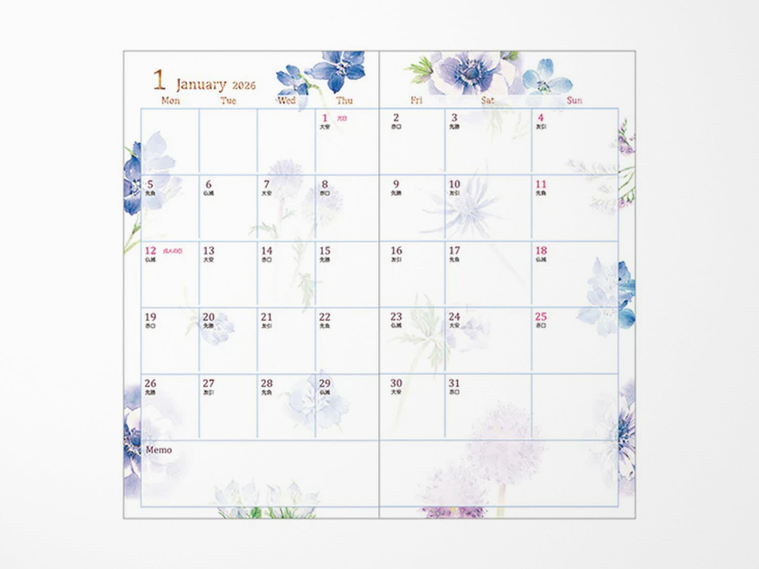 The Midori 2026 Pocket Diary Slim - Country Time Flower is a pocket-sized diary with a monthly layout, dated January 2026 – March 2027. Features seasonal flower illustrations throughout. The slim size is lightweight and easy to carry with you.