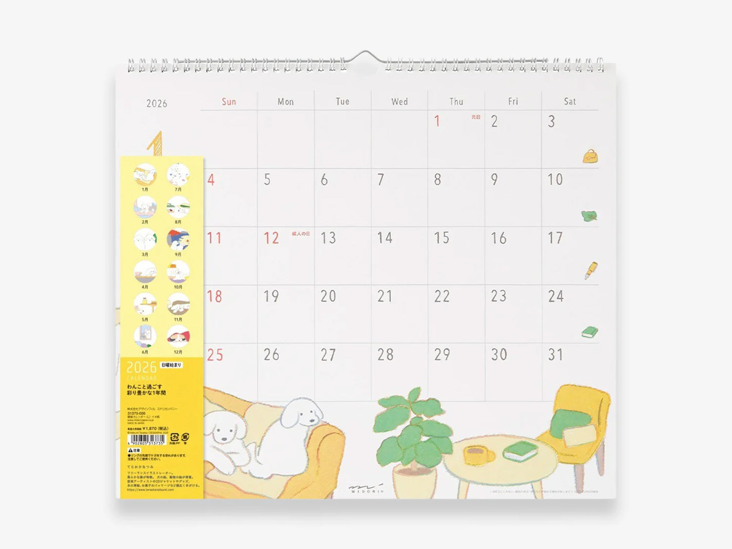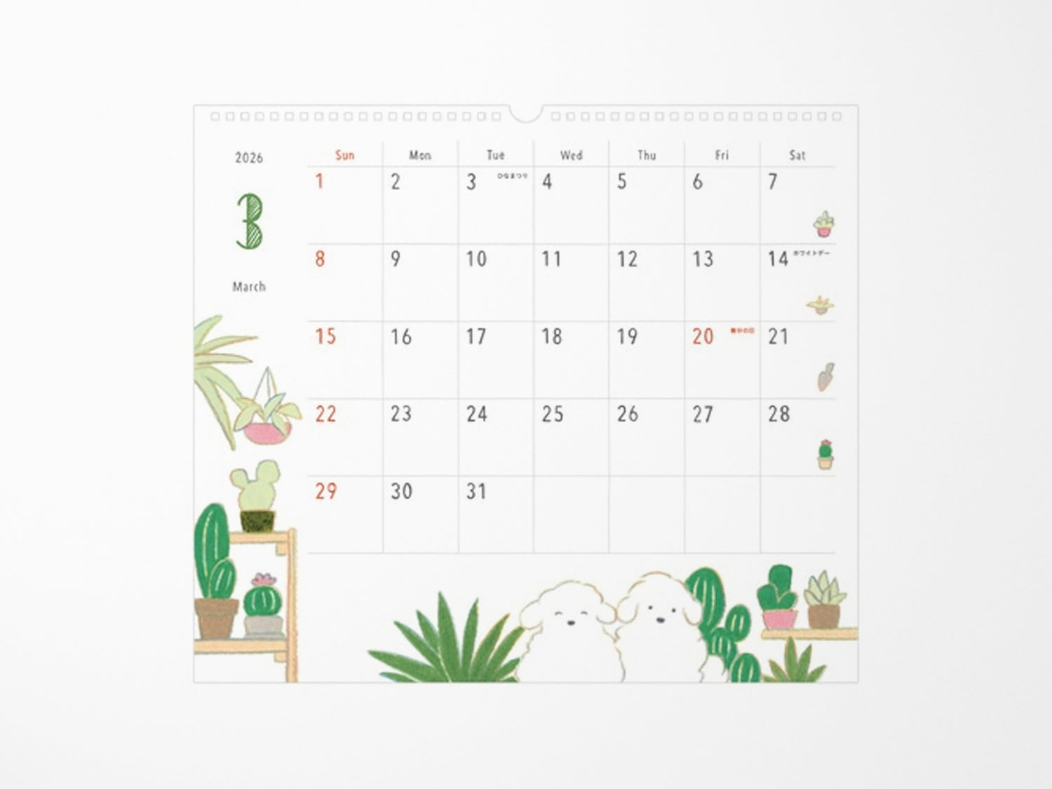 This calendar features colorful illustrations of adorable dogs of all breeds, created by popular illustrator Natsumi Terao. Along with scenes reminiscent of a page from a story, the calendar is designed to refresh your sense of season with each turn of the page. The vivid colors and rainbow-hued outlines of these adorable dog illustrations fill the entire page, creating a layout that meticulously crafted. Even the finer details, such as the lines and date numbers, which at first glance appear to be a font, are hand-drawn. The subtle variations in line intensity, unique to hand-drawn art, create a warm and inviting feel within the simple design.