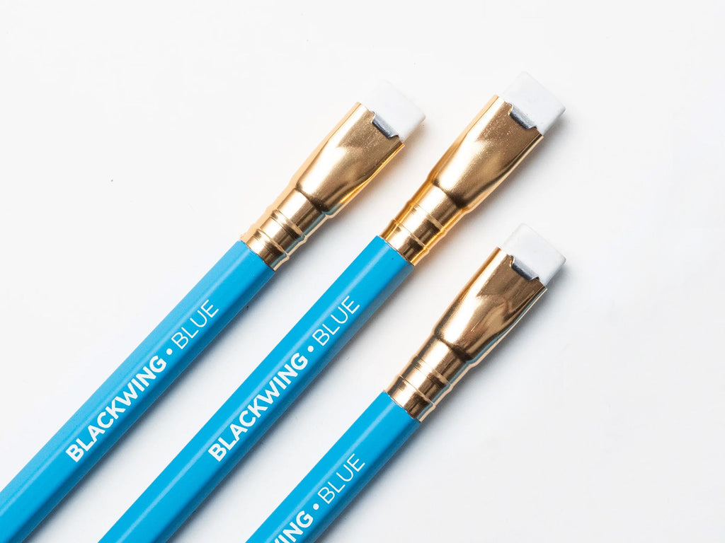 The Blackwing Blue pencil features a non-photo blue core that won’t show up in scans or photocopies. It also includes a matte blue barrel, gold ferrule, white imprint and a sand eraser.