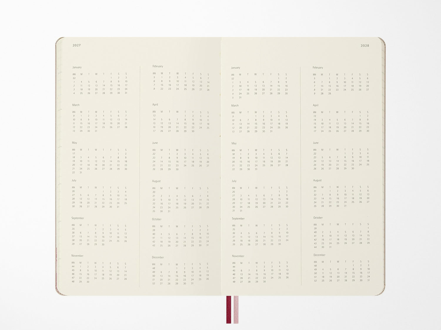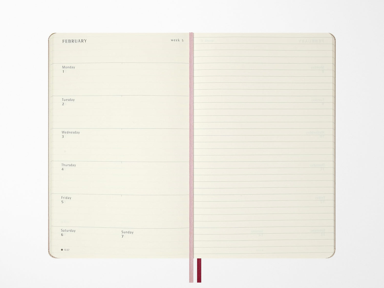- Week-at-a-view, with the days of the week blocked on the left and ruled pages on the right