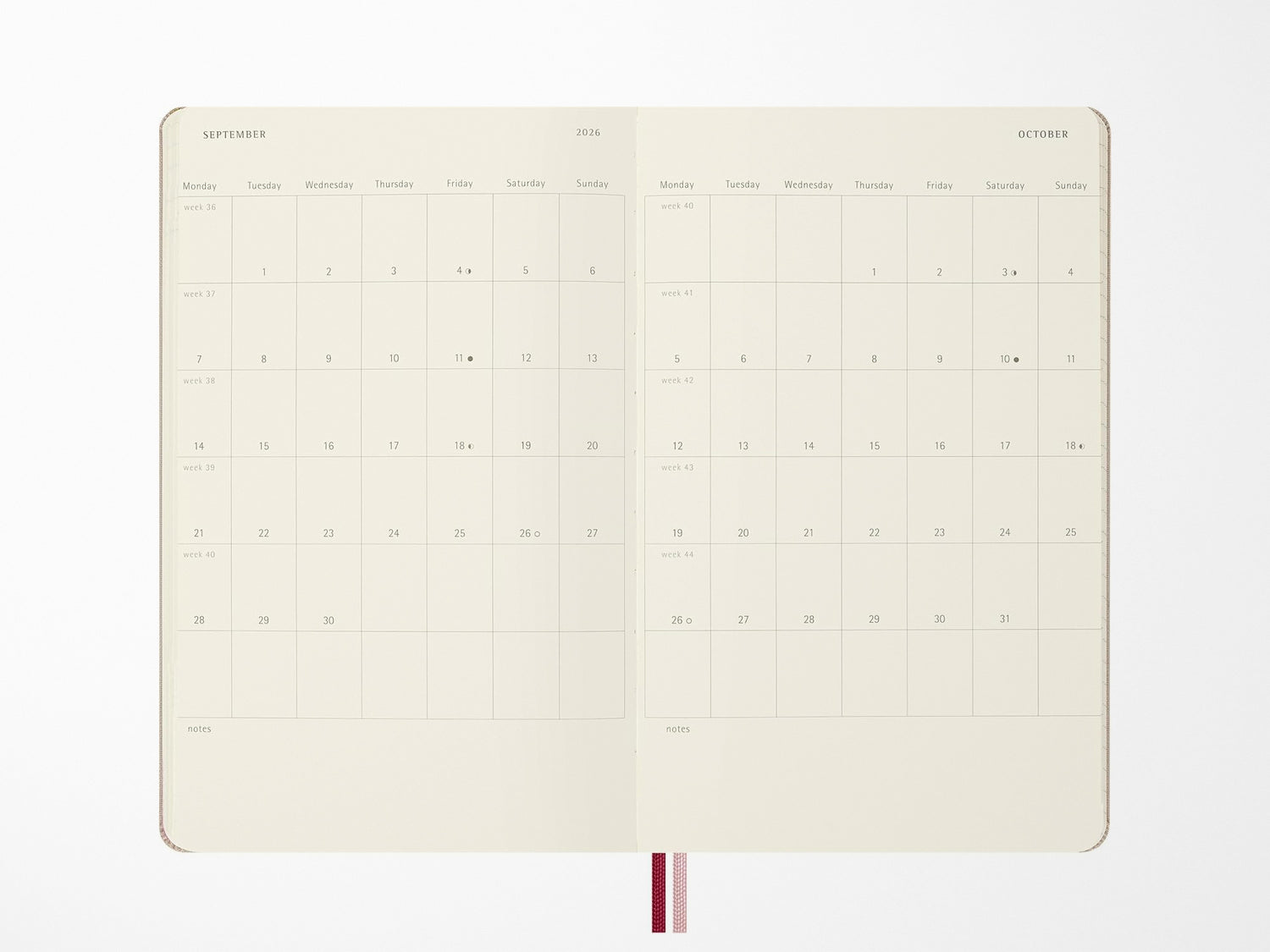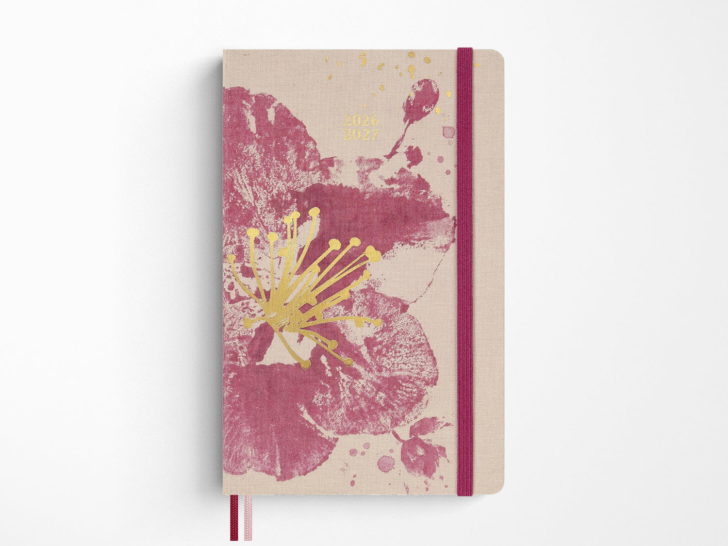 - Rounded corners, elastic closure and two bookmark ribbons