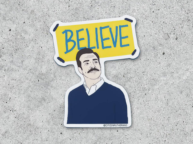 Ted Lasso Believe sticker designed by Citizen Ruth in Portland, Oregon. Sticks on your car bumper, computer, notebooks, or wherever.
