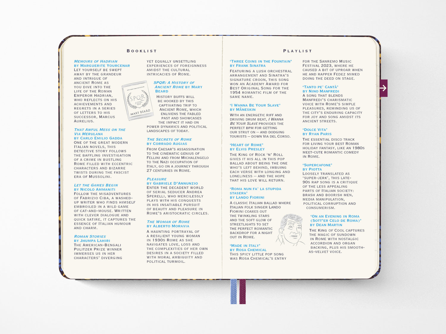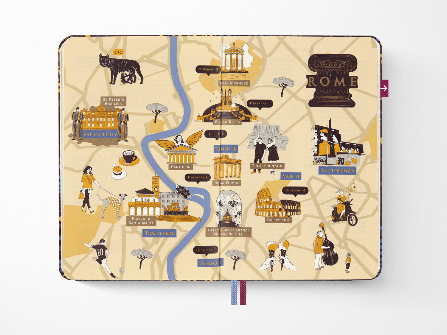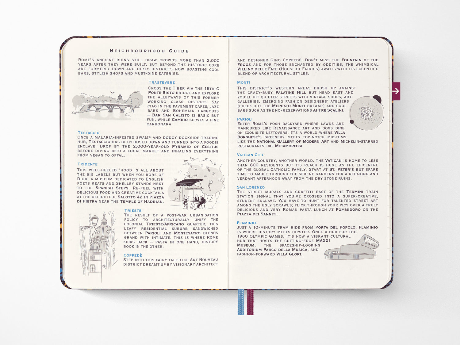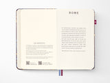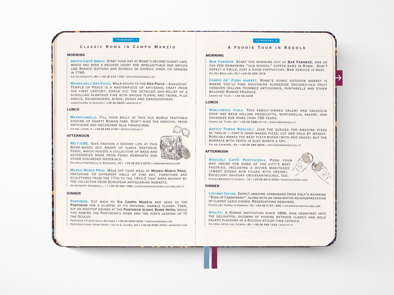 The canvas cover of this Rome travel guide draws inspiration from the city’s iconic, centuries old cobblestones – known locally as “sampietrini”.