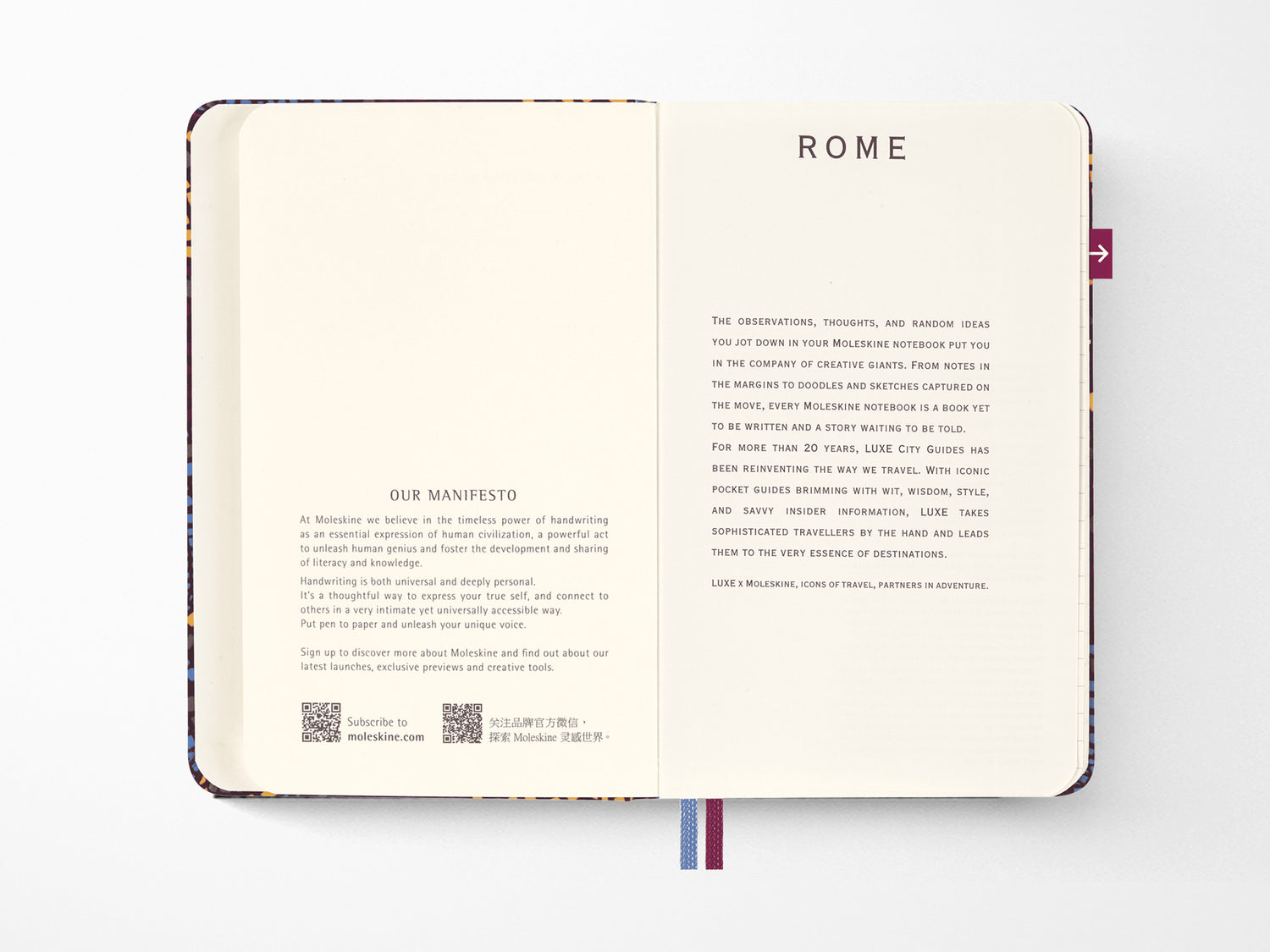 A sophisticated Rome City travel guide with space for the discerning traveller to add their own handwritten observations. The City Notebook is full of bespoke content tailored for Moleskine with insights and recommendations by resident curators. It includes a checklist and planning section, a neighborhood guide, ideas to set the mood, inspiring itineraries, maps and key addresses – including spots hand-picked by Moleskine.