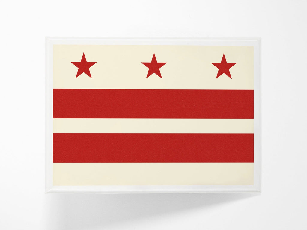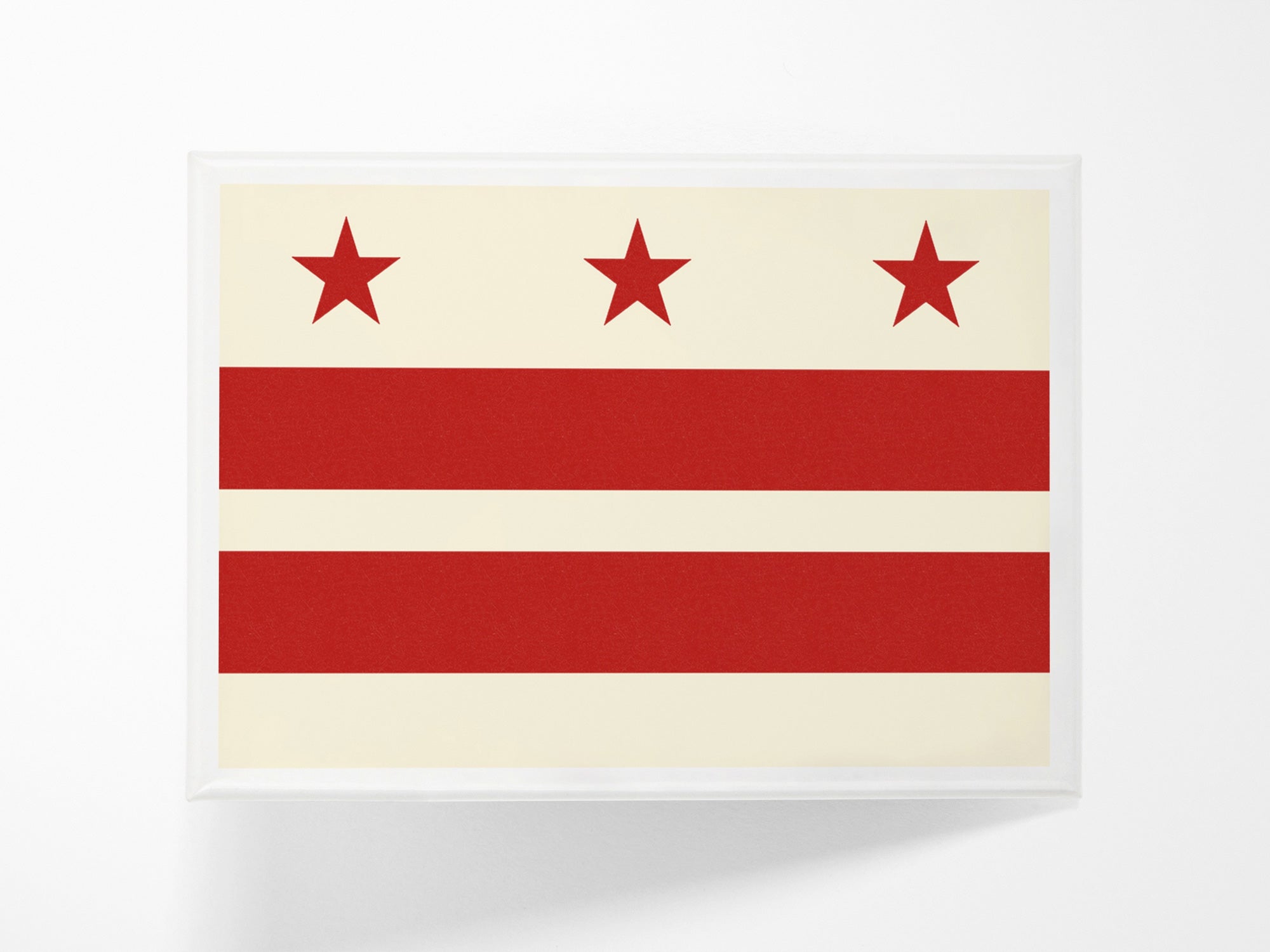 Fridge magnet features the DC Flag. Eco-friendly ink, FSC certified paper, recycled materials, sourced responsibly and planet friendly. Made in USA, supporting domestic production.