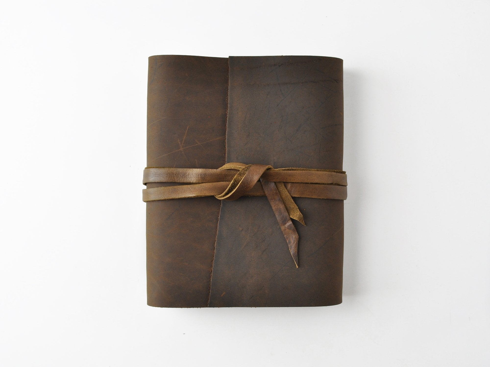 Our original Woodsman 3 ring binder is handcrafted of thick oiled cowhide that will develop a patina and age with you. The unstructured soft cover allows maximum flexibility. A thick contrasting leather strap ties around the binder to hold it closed and protect the contents. Authentic rugged charm...