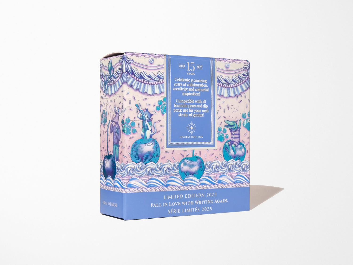 Let there be cake! Ferris Wheel Press is celebrating its 15th anniversary! Join us in commemorating this joyous moment, honouring 15 years of passion and dedication to sharing the love of art and writing with the world. Mark this special occasion with a shimmering Limited Edition ink in a vibrant blue, accented with just the right amount of pink and green sparkle to celebrate.