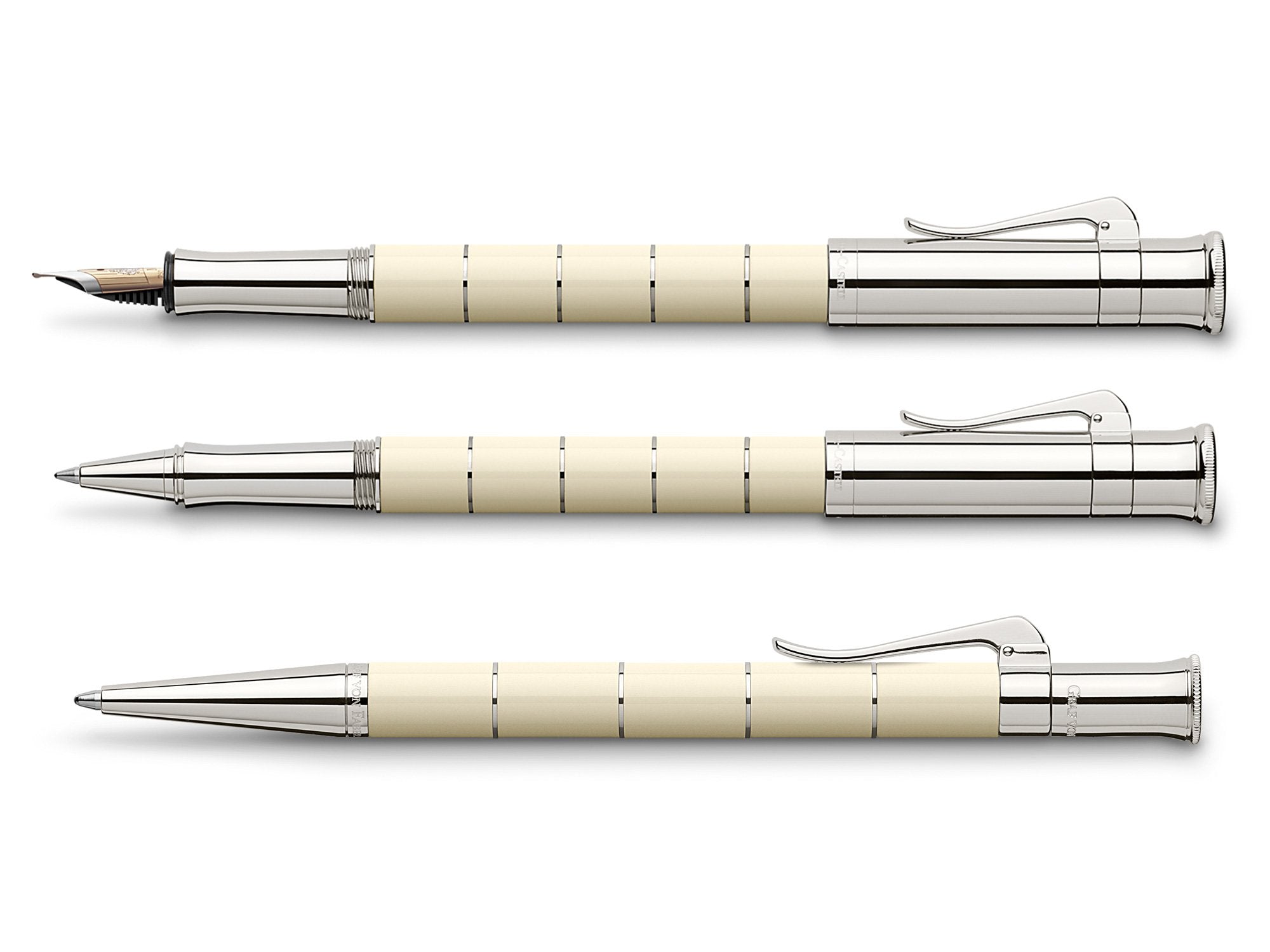 Graf von Faber Castell's Anello line of writing instruments shows how writing culture can be enriched by beautiful materials and craftsman techniques. The Anello Ivory Collection features segments made of polished resin with fine platinum-plated rings between them, giving the collection its name. Perfection to the touch as well as the eye.