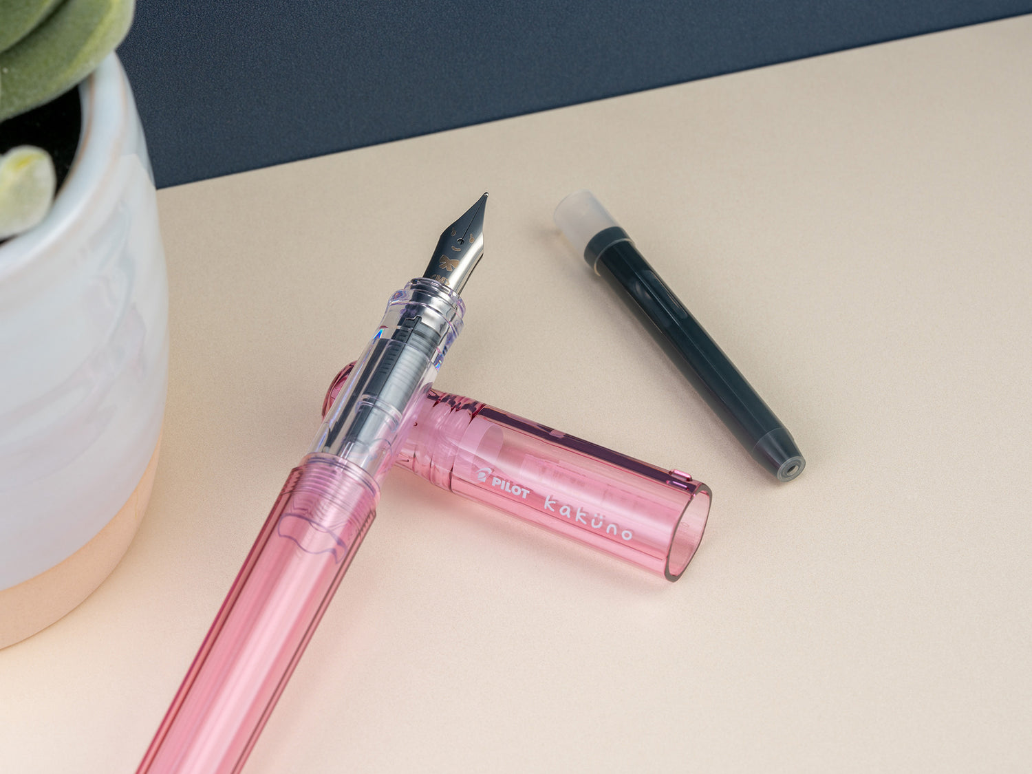 The Kakuno Fountain Pen from Pilot features a transparent pink body, a twist-off cap, and a flexible steel nib. Writing with a fountain pen allows a greater degree of creative expression, and changing out the ink colors is fun!