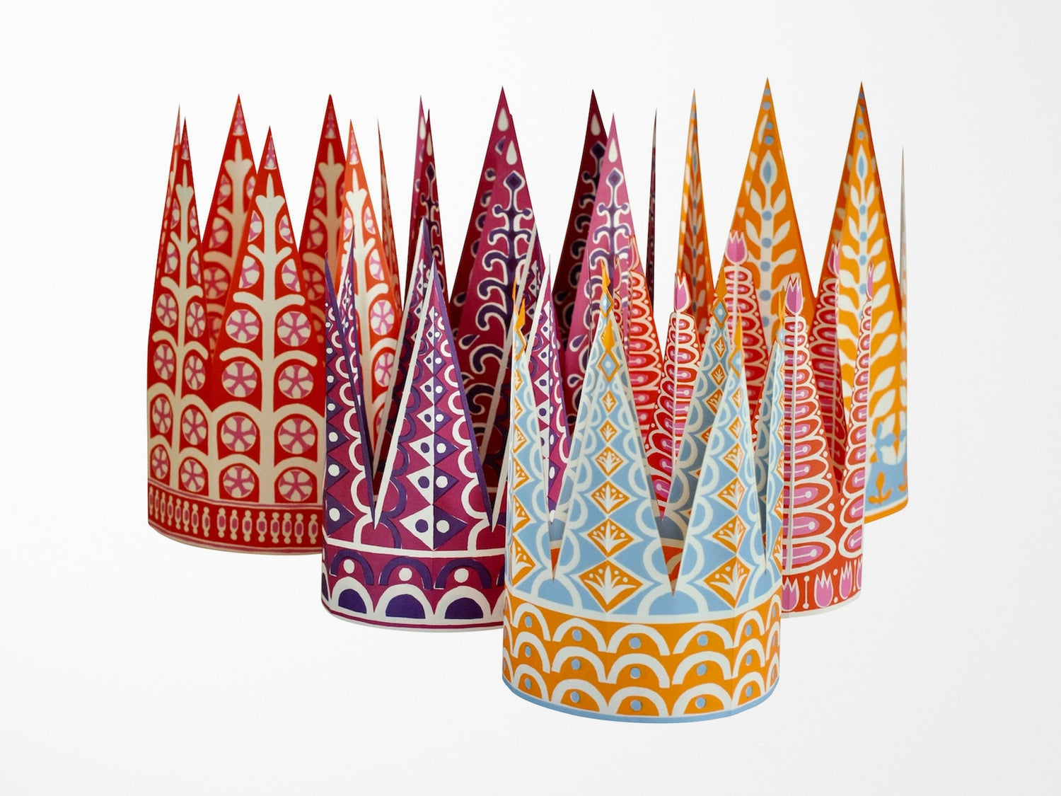 Six tall patterned crowns for feasts, parties, high days and holidays. Six Different Magnificent Designs. Never again will you be satisfied with one of those feeble tissue paper hats that comes out of a cracker. Some minimal assembly is required, and this allows the crown to be adjusted to the size of the wearer's head. Scissors and either glue or tape will be required and are not included.