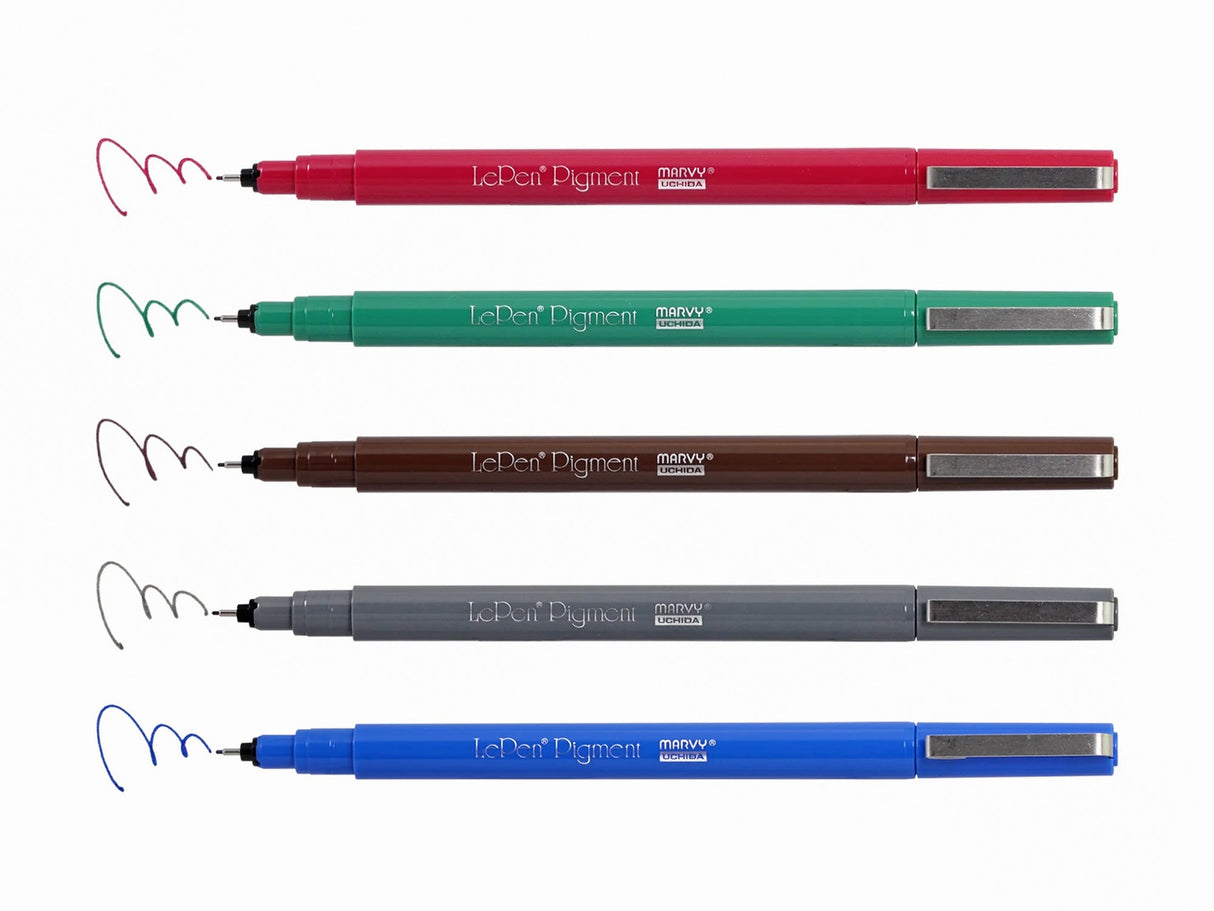 LePen Pigment is excellent for drawing, art, planners, journaling, lettering, and more. The extra fine synthetic tip delivers a smooth, consistent ink flow. They work well on thinner papers and won't bleed through. The ink is water-based pigmented which is quick-drying and smudge resistant.