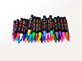 Opaque, water-based acrylic paint is non-toxic and acid-free. Odorless, light-fast, Xylene-free, lead-free and waterproof when dry. Mark on metal, wood, glass, plastic, plaster, canvas and more. Excellent for signs exposed to the weather. Great for temporarily marking up glass windows. Popular with surfboard painters. Fluorescent colors are used extensively by auto dealers to mark windows with advertisements and collision services.