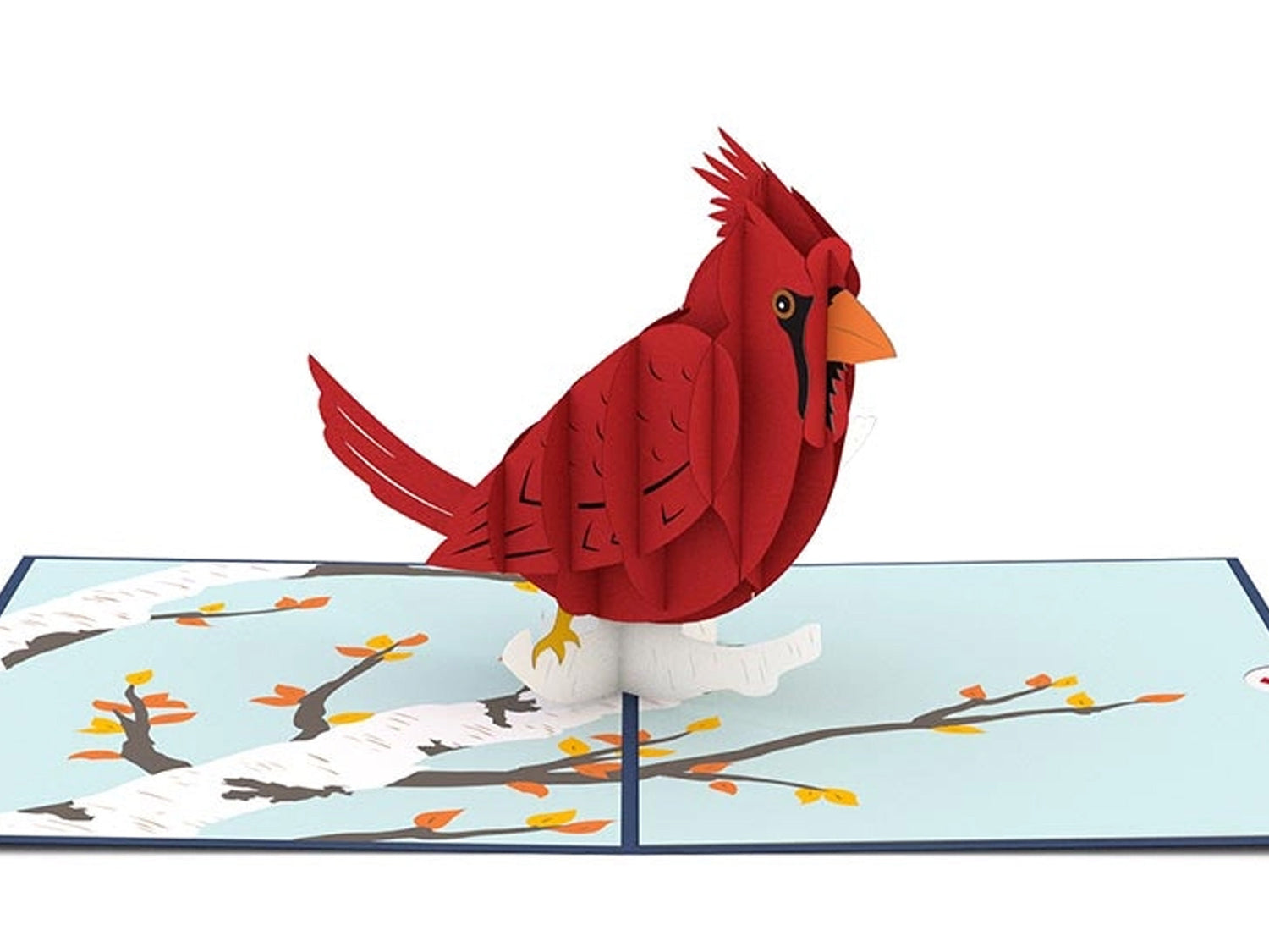 The Cardinal pop up features a navy blue cover laser-cut with a beautiful red cardinal perched upon a gray branch with orange and yellow leaves. Once opened, a red Cardinal reveals itself all perked up on a white branch. Below the Cardinal sculpture, the white and gray branches with little, orange and yellow leaves support the bird as it oversees its surroundings. The inside panels are also printed with a sky blue color that fits in perfectly with the beautiful scene. Inspiration for the Cardinal card: Lovepop designer Kincso was inspired to make the Cardinal pop up because it is one of the most popular species amongst all birders and non-birders.