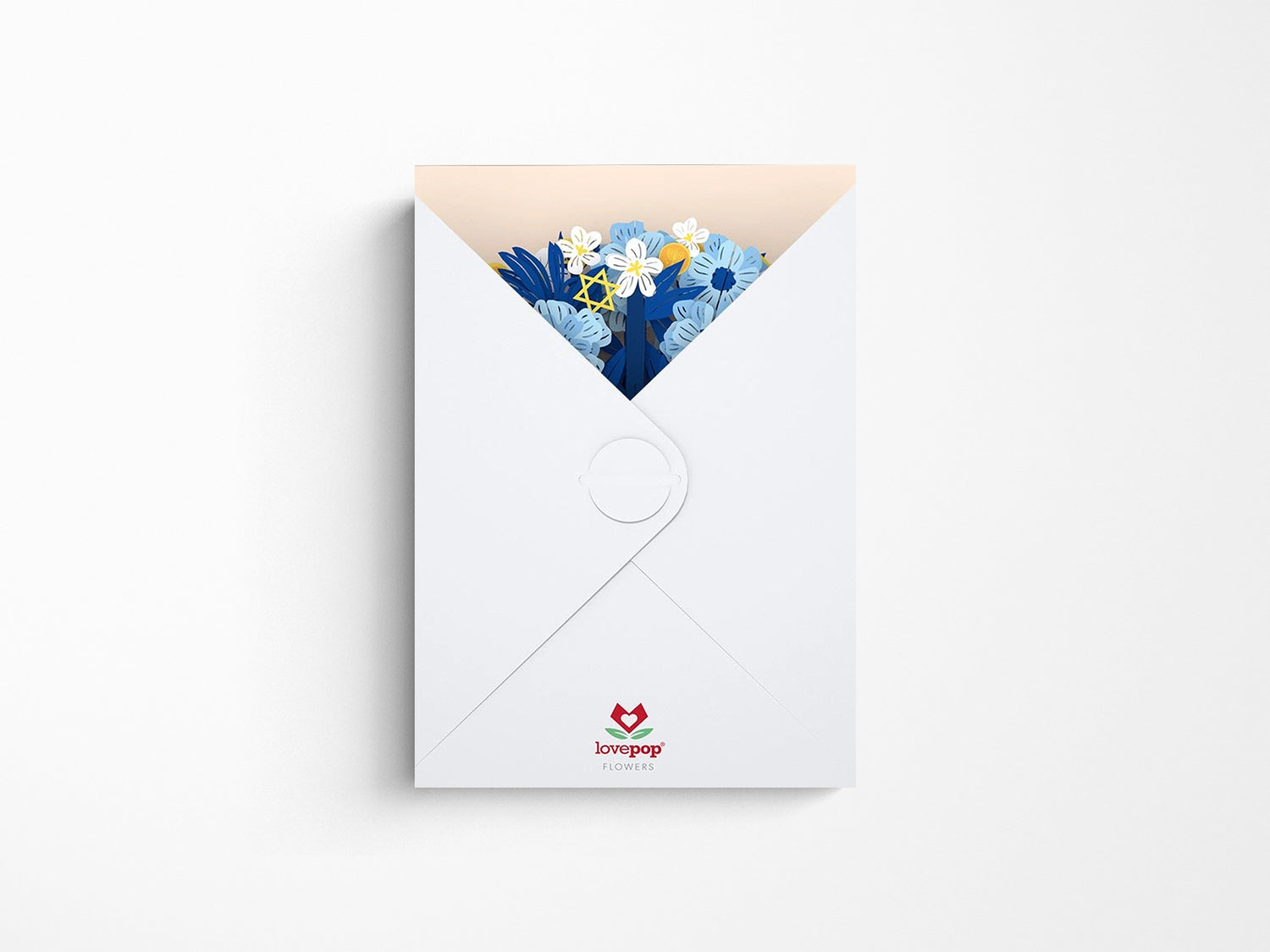 Lovepop Flowers have the same intricate detailing as all of our Lovepop greeting cards, and they come beautifully packaged in a protective envelope. Allergy-friendly, portable, and long-lasting, these flowers can be shared with anyone, go anywhere, and will never wilt. This intricate paper flower bouquet features a blue, white, and gold color scheme, perfect for Hanukkah. The deep ocean blue of the paper leaves contrasts perfectly with the powder-blue and white flowers. Each stem, leaf, and petal contains intricate cut-out detailing. Nestled among the bouquet are yellow Stars of David and golden pieces of Hanukkah gelt, complete with tiny menorah stamps.
