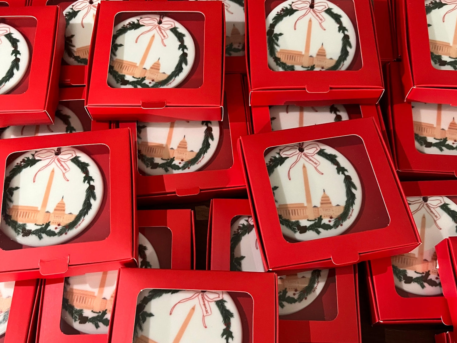 Decorate your Christmas tree with scenes of the Capital. This high-quality ceramic ornament features the iconic images of D.C. - the Capital Building, Washington Monument, and Lincoln Memorial - wrapped by a wreath and finsihed with a bow. It will hang securely from its sturdy red cord.