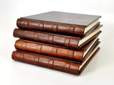 This handsome leather bound volume features a hard manuscript cover with library ribs on spine and squared corners. The pages inside are archival quality paper chosen for opacity and ink absorption. Pages are lined.