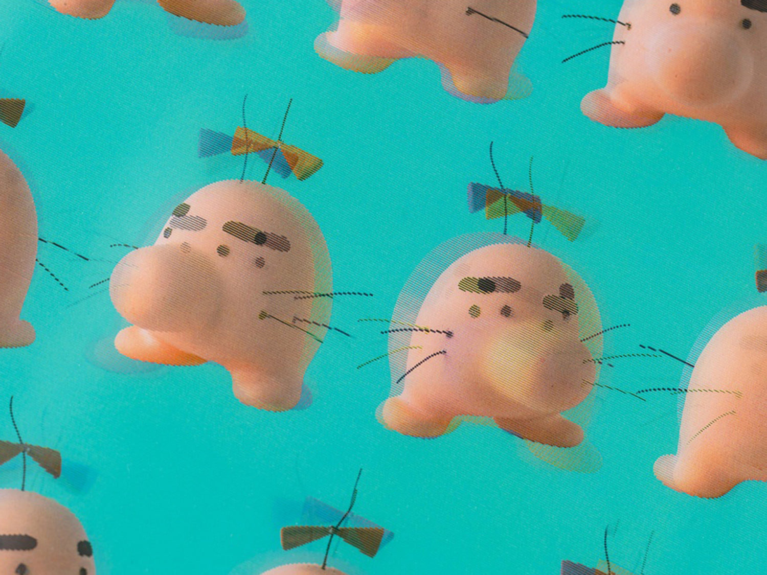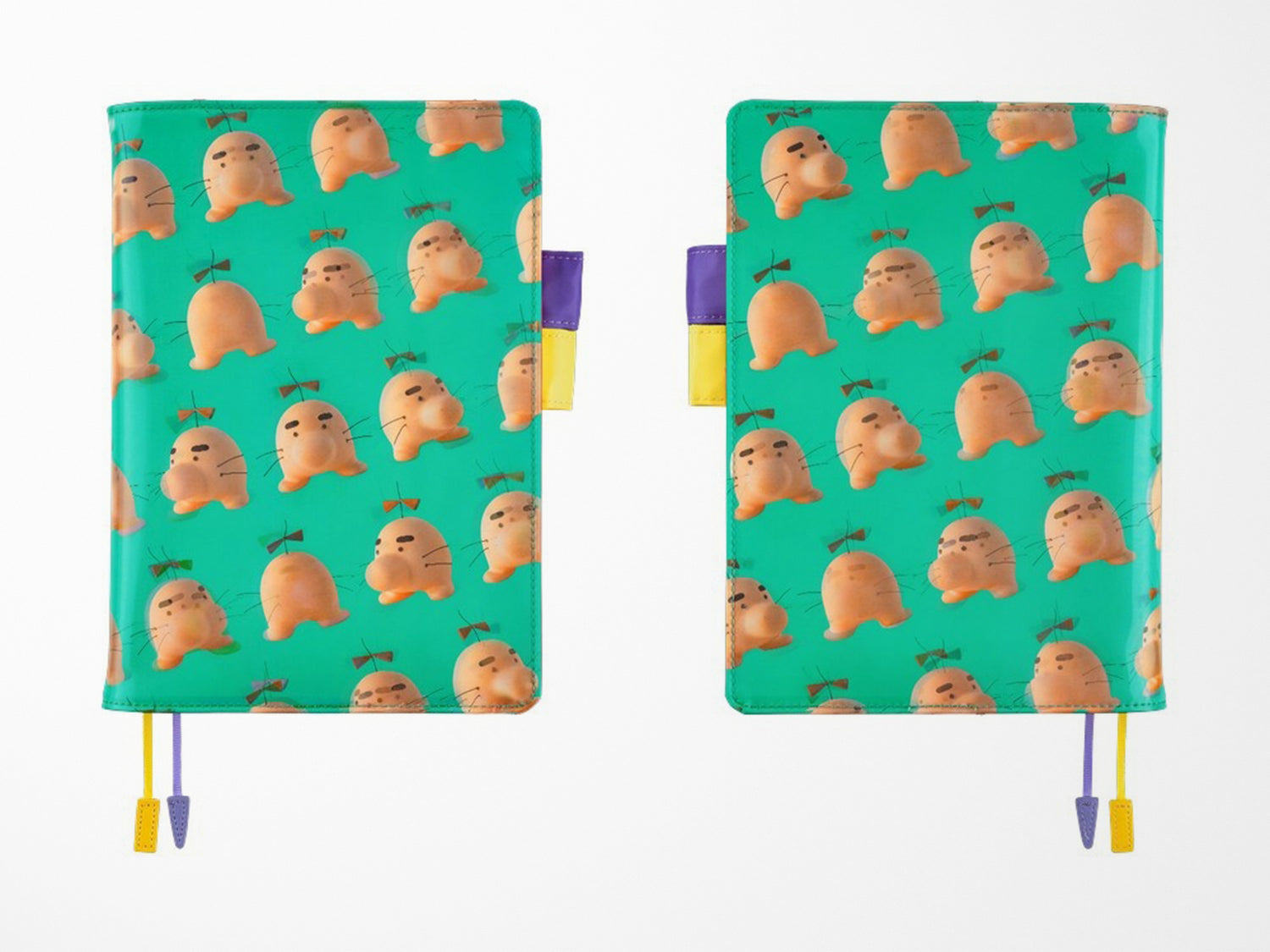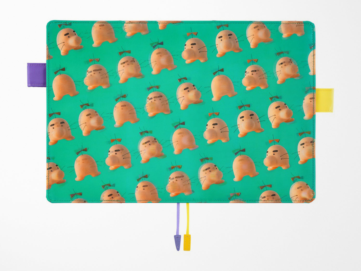 A bunch of Mr. Saturns are printed onto a mint green background The lenticular print makes it so that whenever Mr. Saturn moves around and around, charmingly, so does the ribbon. The cover interior is a hot pink. As a bonus, a paper clip in the shape of Mr. Saturn is also included. The cover has "butterfly stopper" pen holders, which also function as a clasp to keep the cover shut.