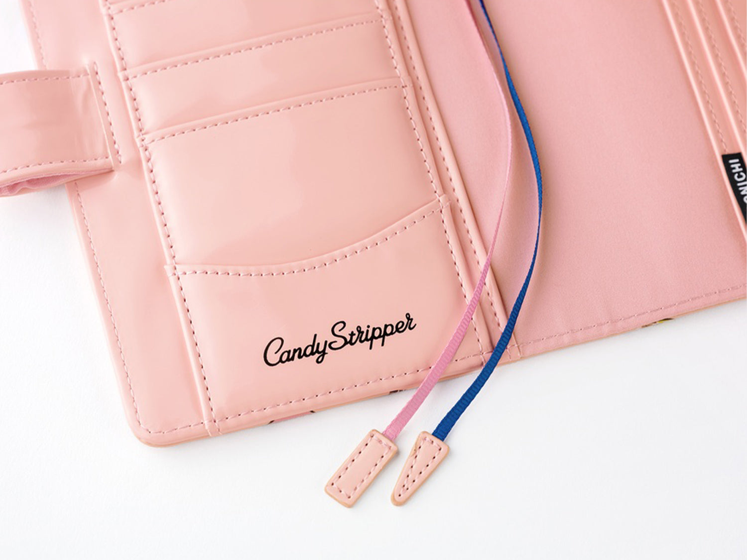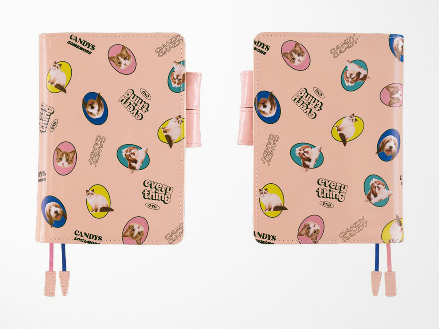 A cover in collaboration with the fashion brand “Candy Stripper.” Heart-meltingly cute pictures of dogs and cats are randomly interspersed with the brand logo. The shiny enamel material and pale pink background make for a fashionable item. It has "butterfly stopper" pen holders, which also function as a clasp to keep the cover shut.
