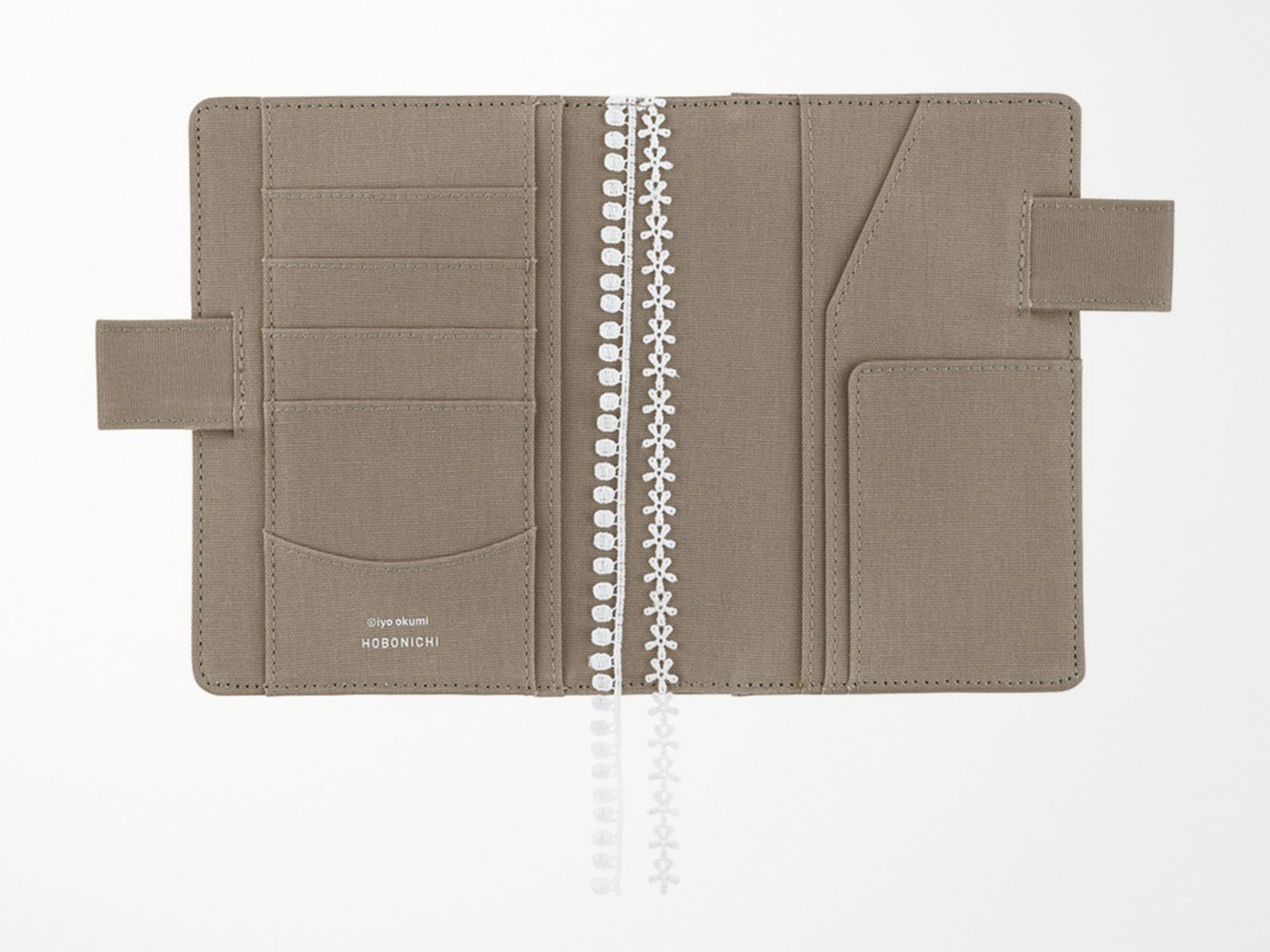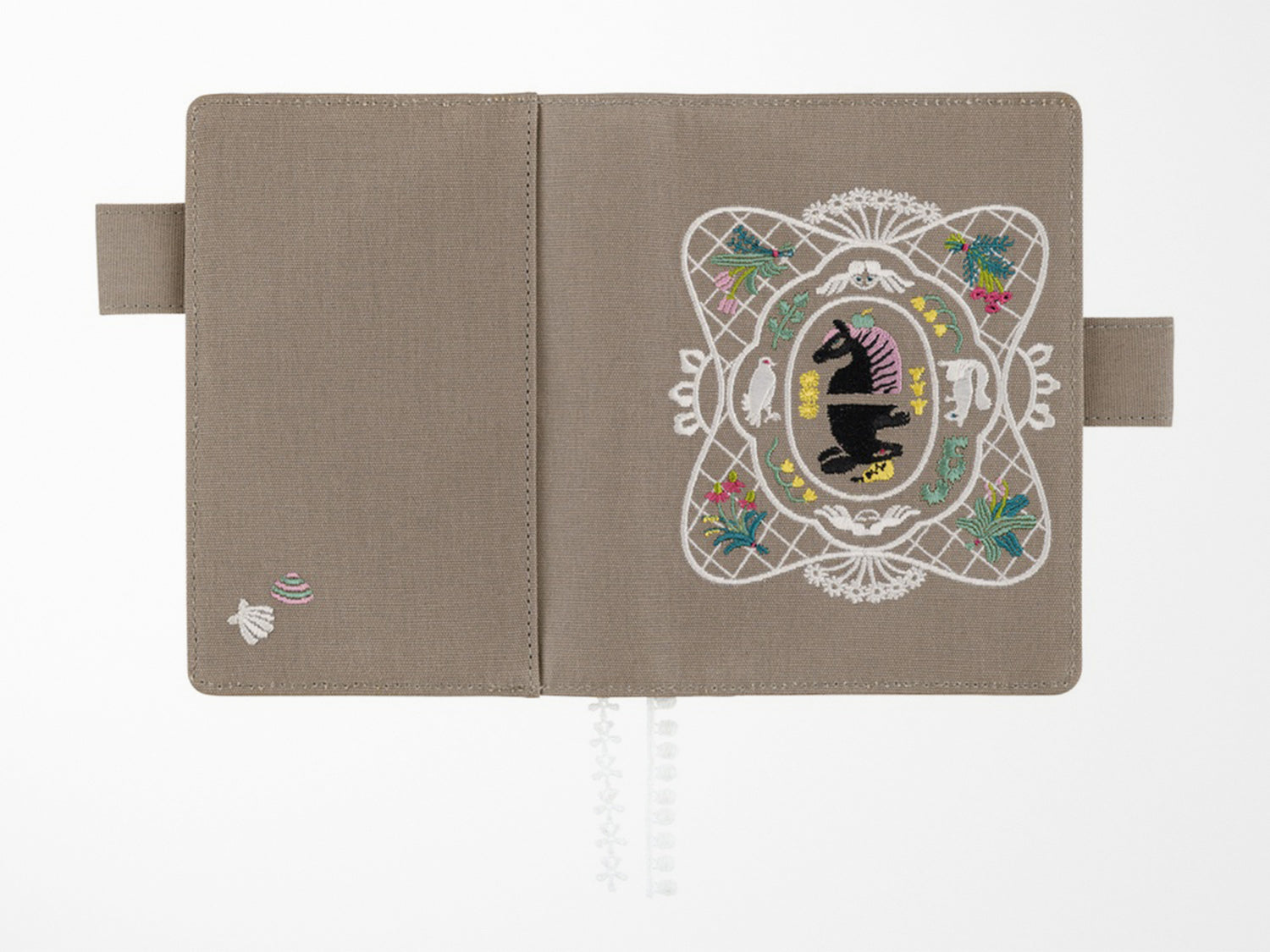 Designed with an embroidered work by embroidery artist and illustrator iyo okumi. A romantic design of things that you can find in everyday life around you, like animals and plants, that are delicately embroidered onto a calming, gray fabric. The white lace border gives the cover a classical feeling. It has "butterfly stopper" pen holders, which also function as a clasp to keep the cover shut.