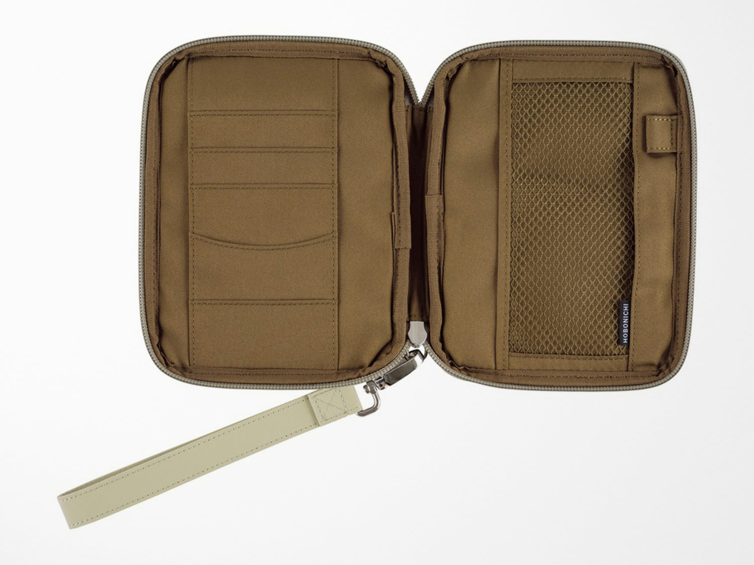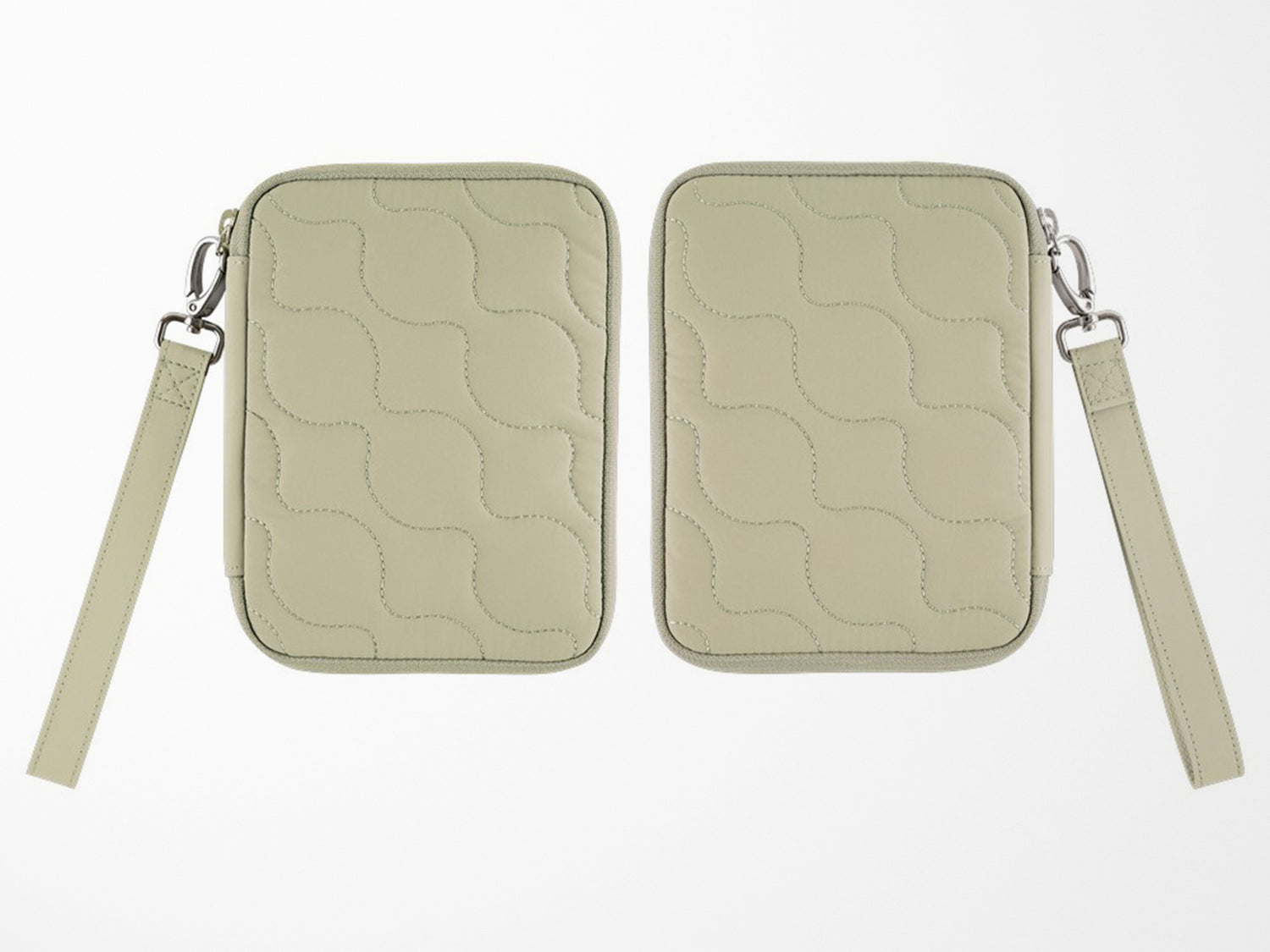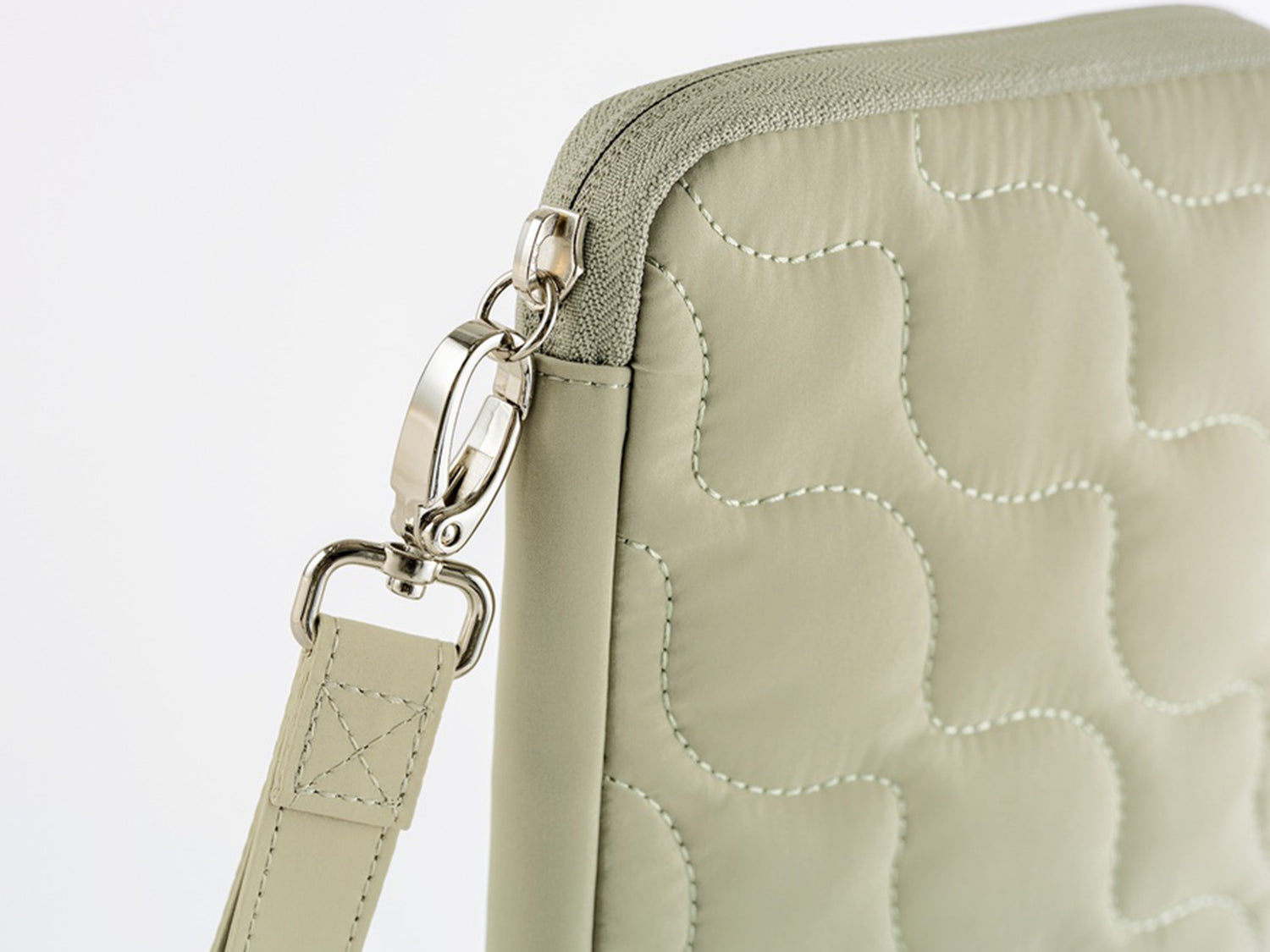 A pouch-like cover in a pale sage green quilting material. The soft base layer makes this cover durable, so you can freely throw in your techo and notepad, stationery, smartphone or other item to easily carry around with you. The cover can be zipped shut, and inside is a pen hook that can store a pen by its clip.