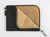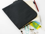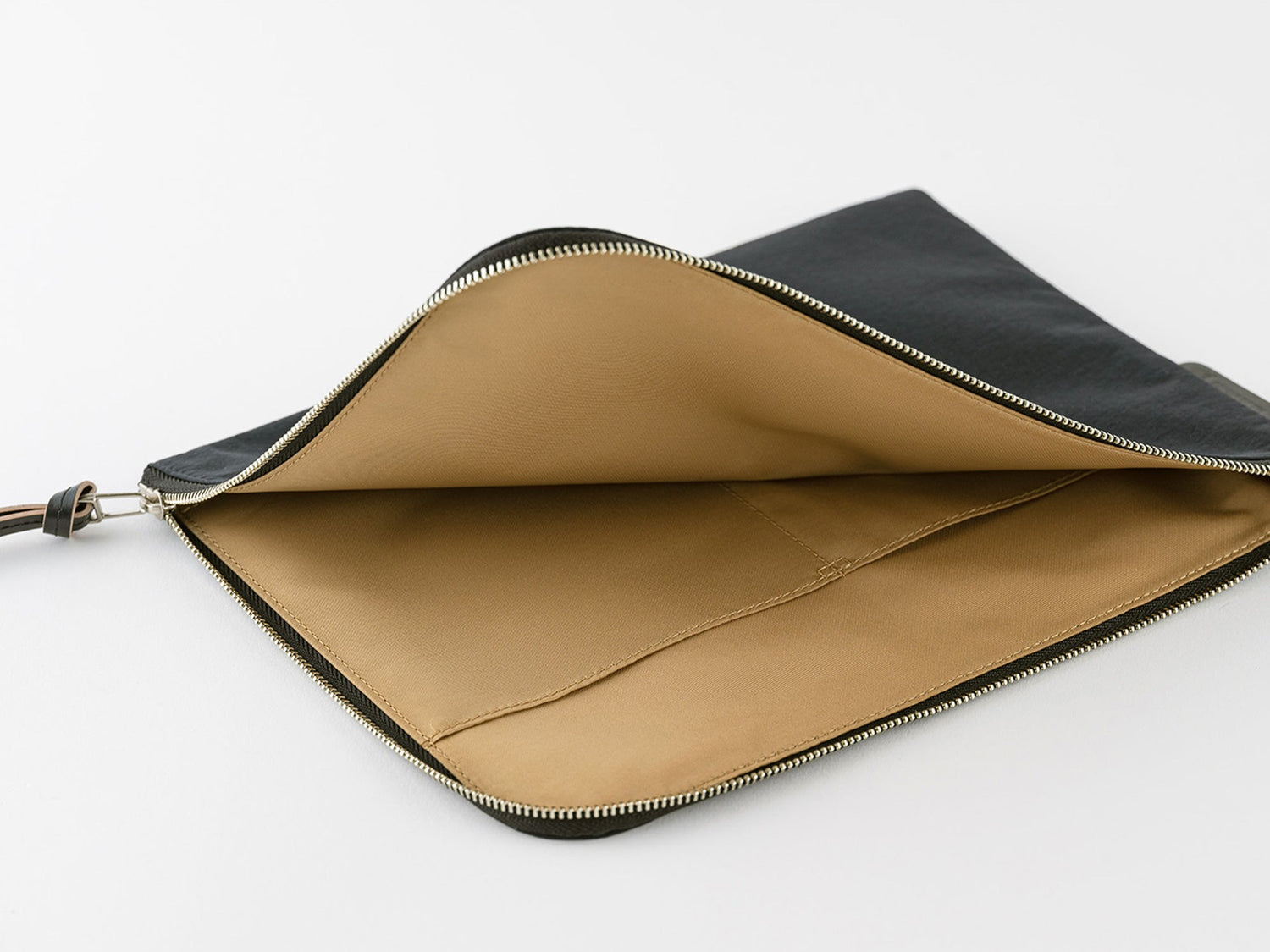 This flat pouch can store an A5 size HON. The L-shape zipper opens the pouch extra wide for easy access. This pouch is nice and light to hold and is made with the same material as the tragen cover, which uses a soft nylon with an elegant sheen.