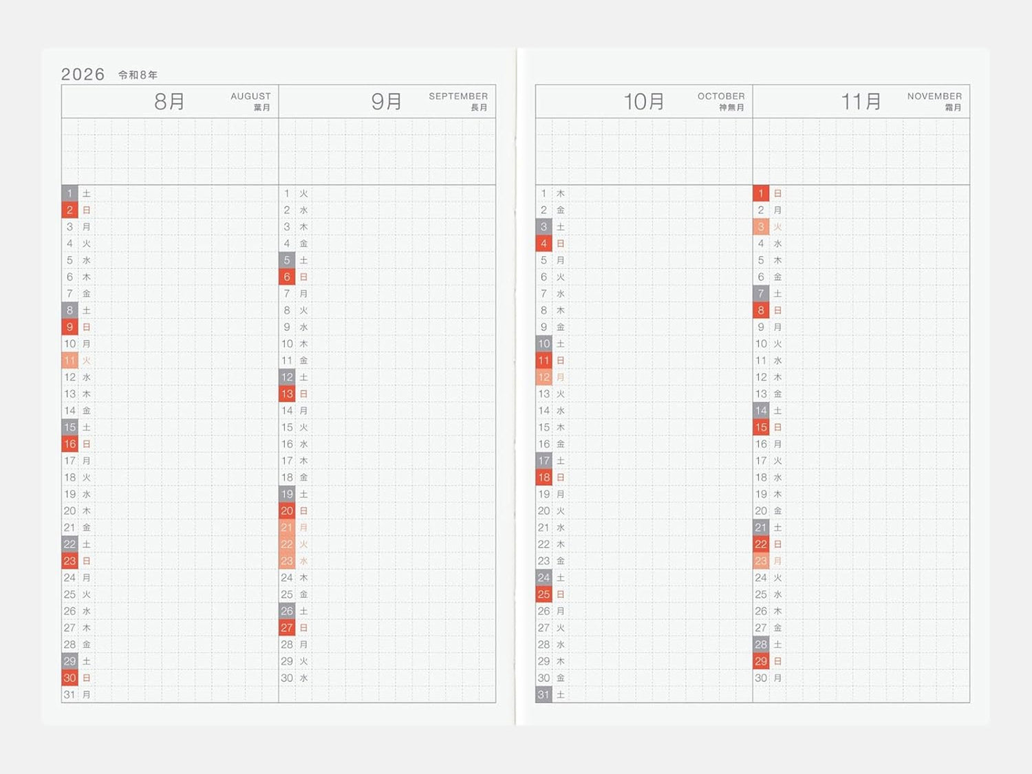 ONE PAGE PER DAY - Each day has its own page with ample blank space to help you use the techo any way you like. The 3.7 mm graph paper provides optimal writing comfort. The line colors are subtle enough so users can either customize it to their own layout or ignore it completely. This book includes inspirational quotes on each daily page in Japanese. The book uses thin and light yet durable Tomoe River S paper which provides a high page count with a compact design.