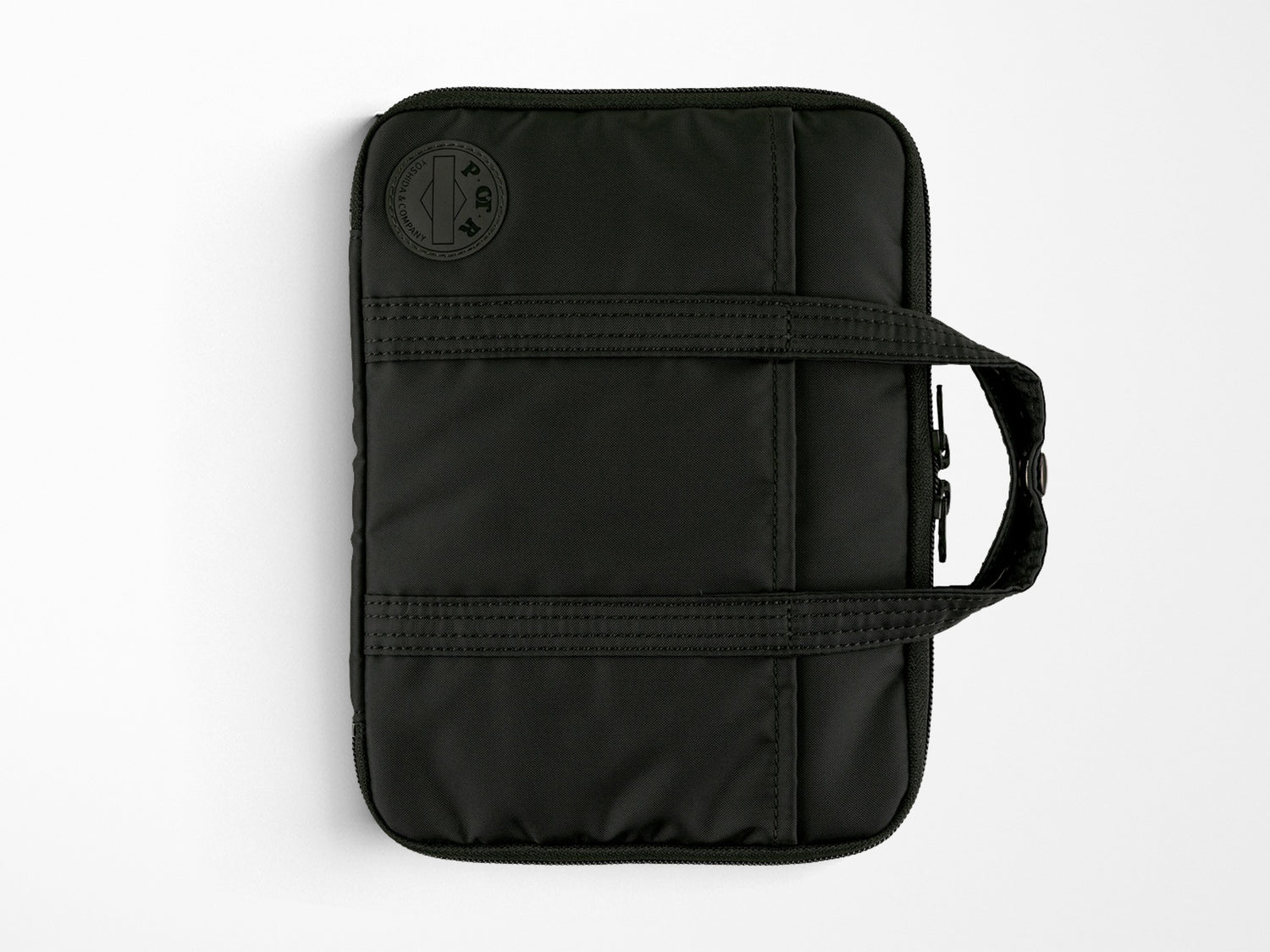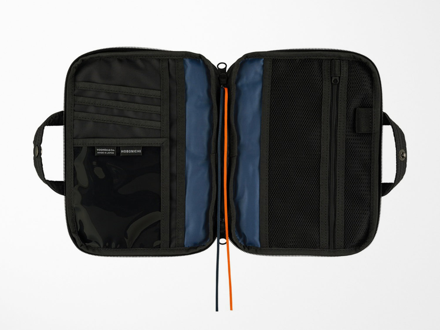 The Cousin size is black. It has a sharp, crisp look and is a signature color of Yoshida & Co. The attached shoulder straps make it easy to carry around. Once you open the zipper, you will find that the lining is in a combination of black and navy. The left side includes three card pockets, as well as a clear pocket big enough to fit your passport. This design is reminiscent of a small bag and was created with POTR.