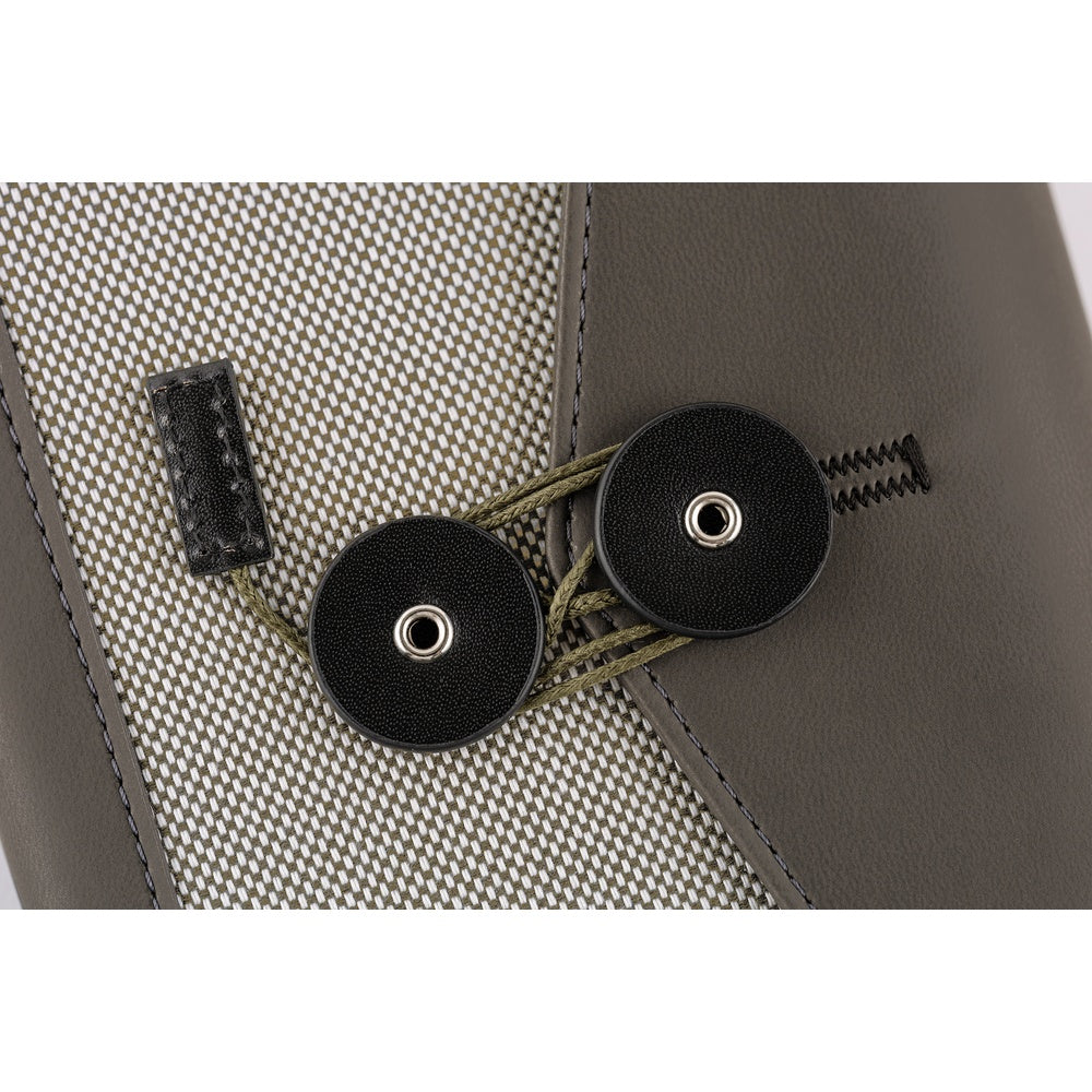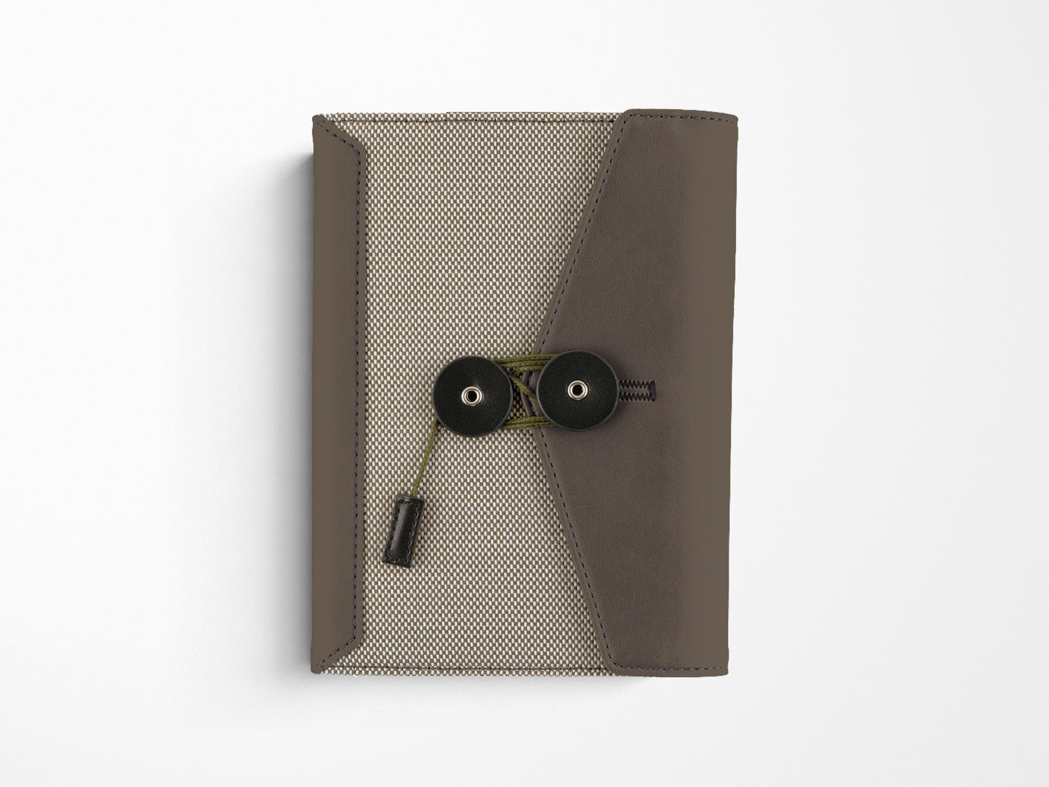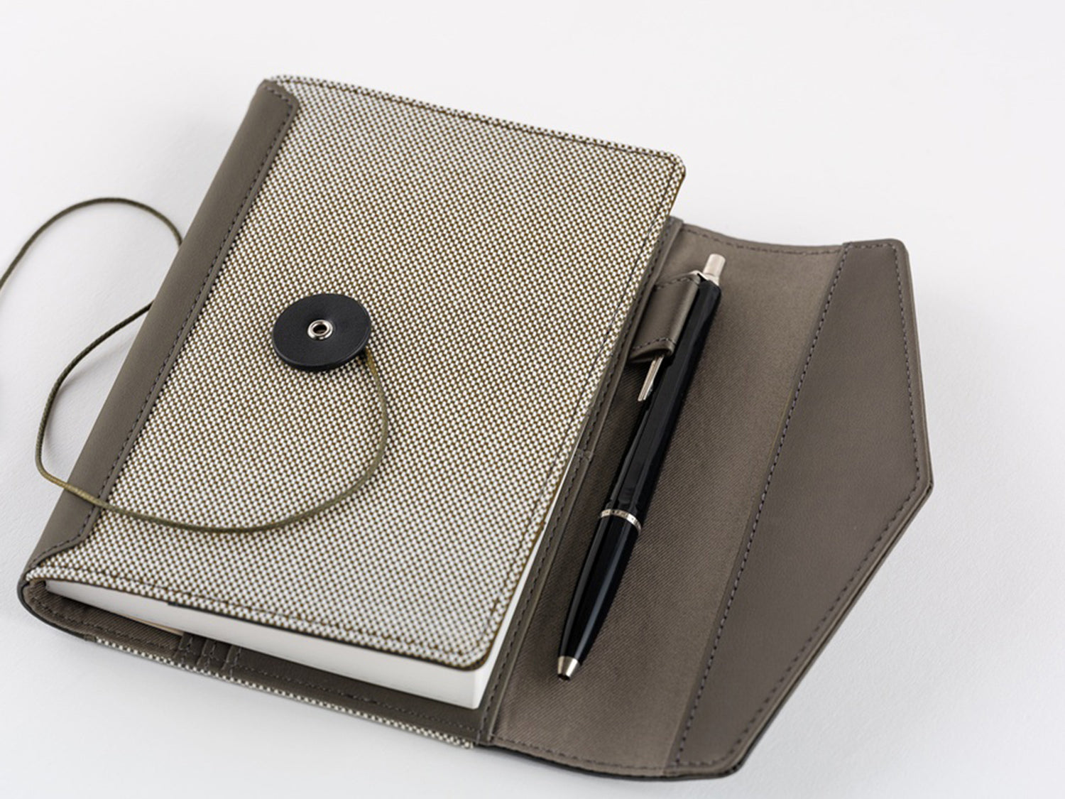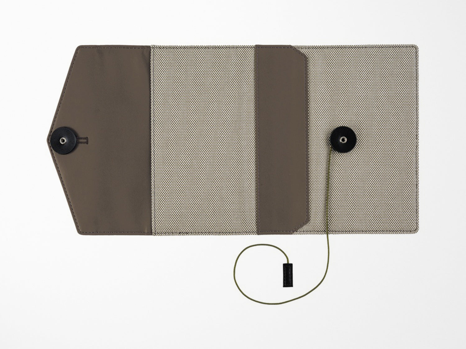 The ball-button closure, triangular flap and the use of two different types of textures in the fabric make for three unique key features of this cover. Made with the wish for you to enjoy the time you spend reflecting on yourself—almost as if you were writing a letter. Even the time you spend wrapping and unwrapping the string around the cover is meant to be a time to cherish. This tri-fold cover stays shut with a button and has an interior pen hook to store a pen by its clip.
