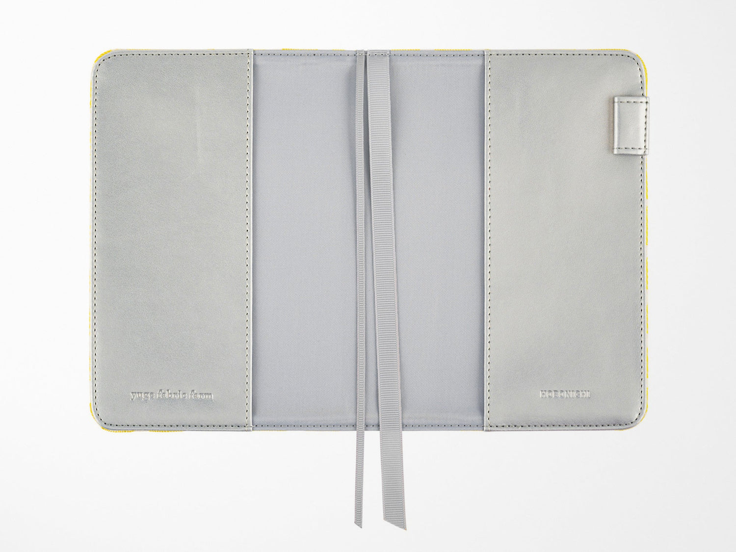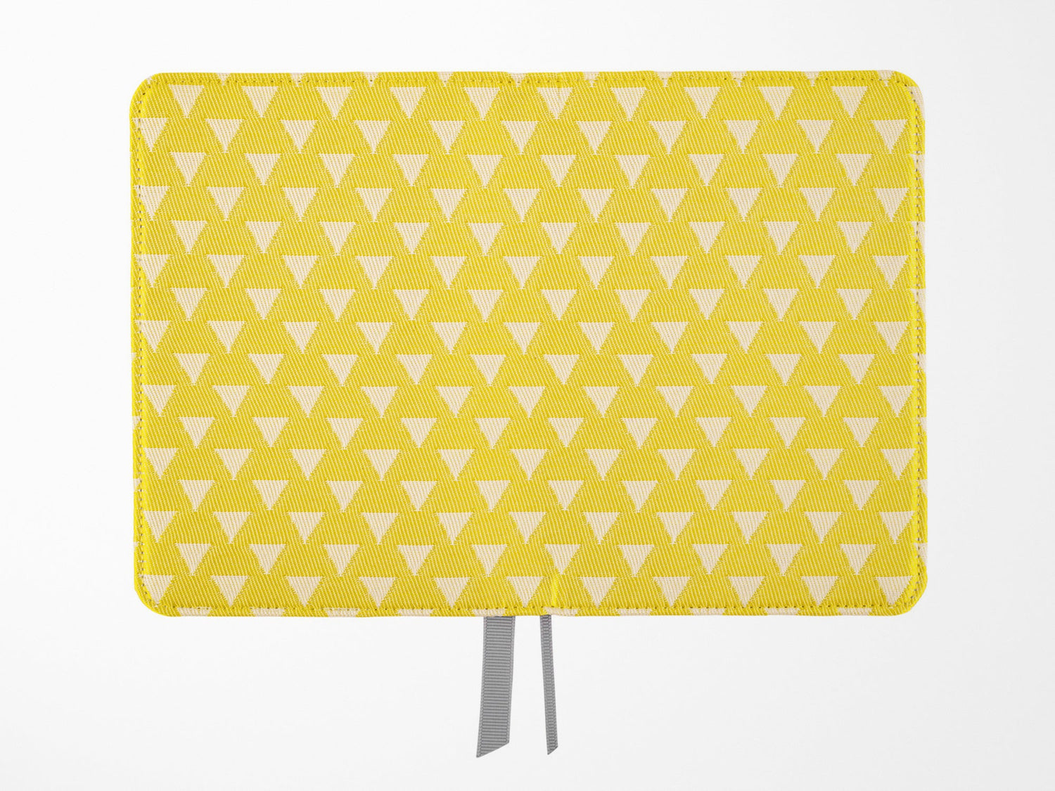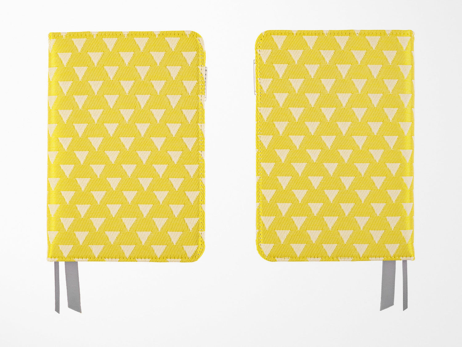 This cover uses brocade fabric with an "uroko” design: triangles that symbolize scales, which originates from ancient China. You can immediately see the intricacy of the weaving, which looks beautiful in vibrant yellow. Design by Yuge Fabric Farm. It has a simple shape and includes a hook that can store a pen by its clip.