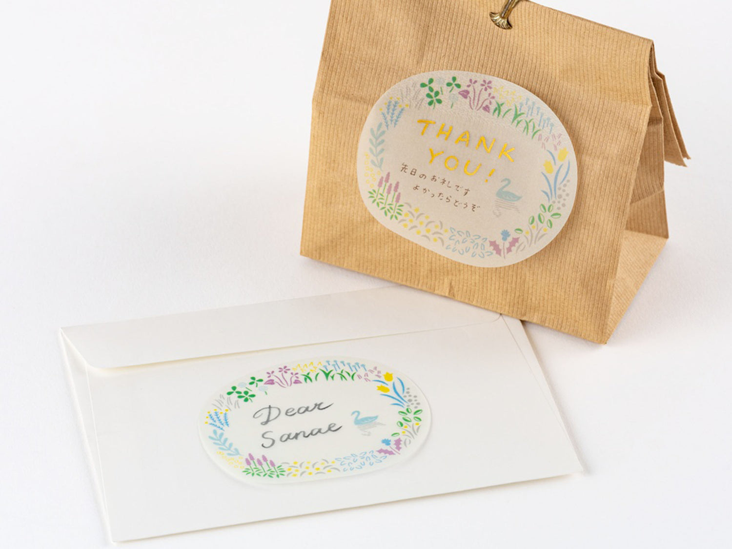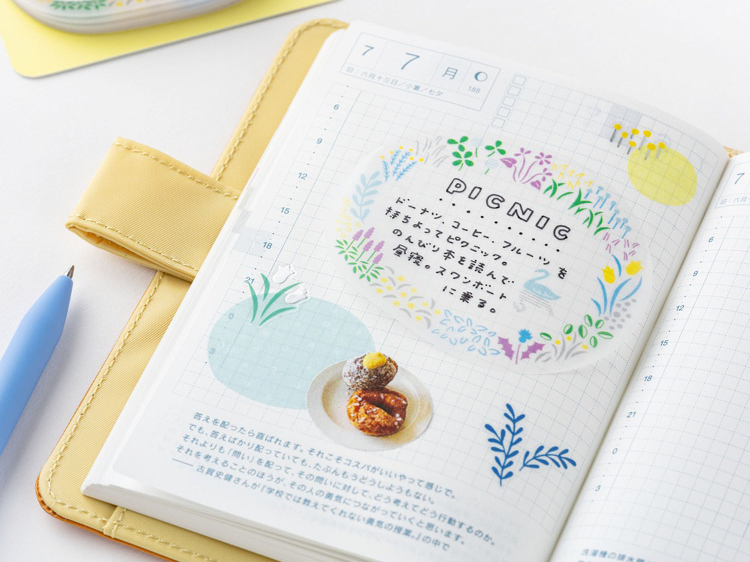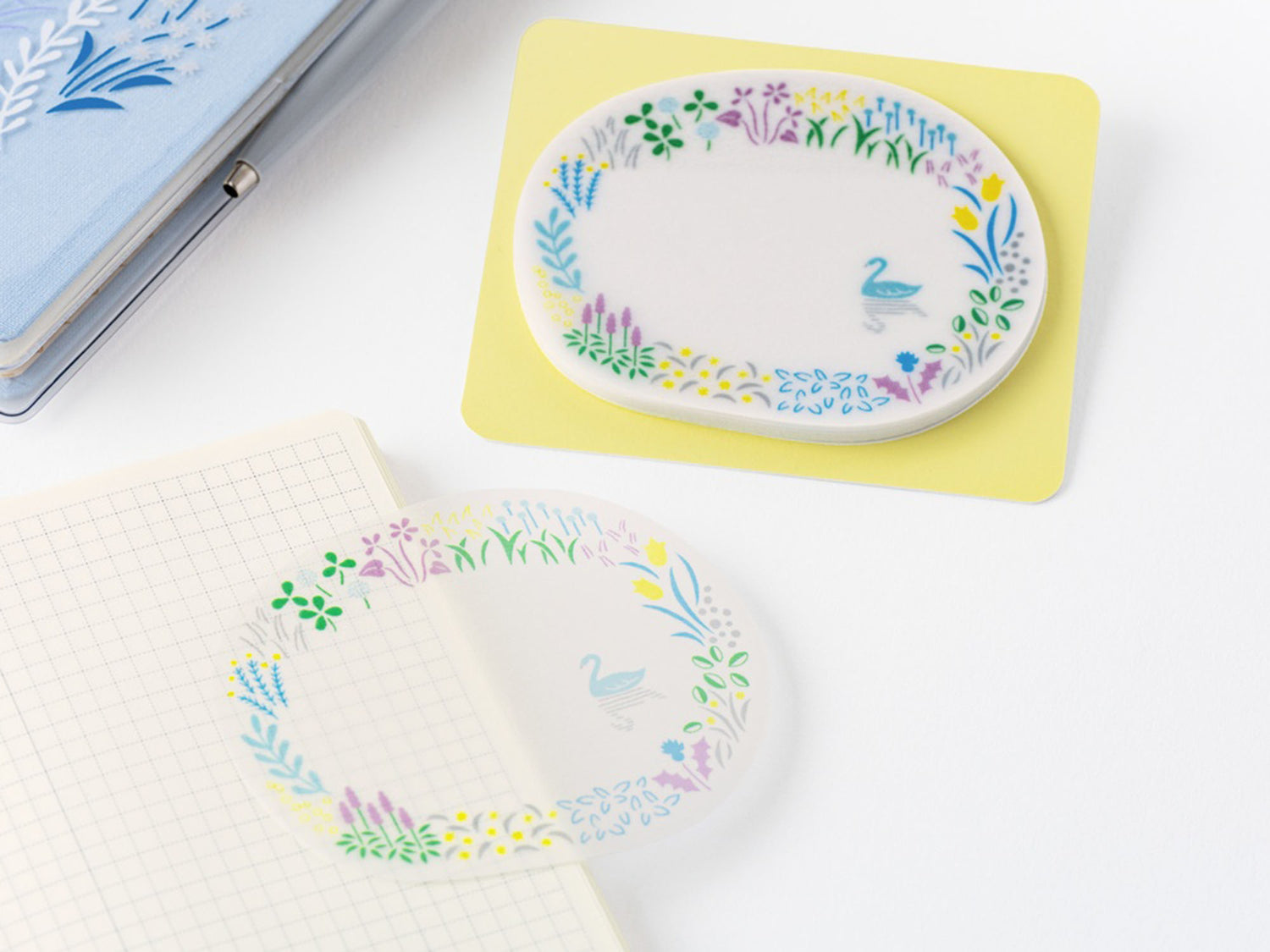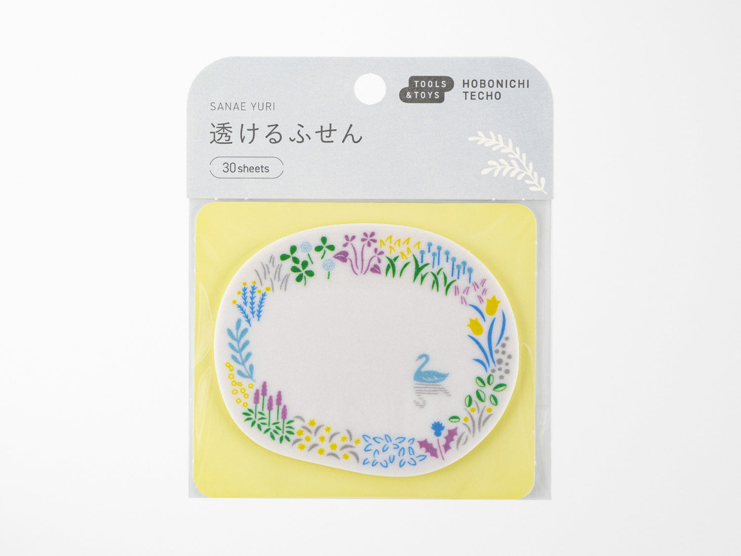 Sticky notes made from translucent glassine paper. Designed by graphic designer and illustrator Yuri Sanae. Inspired by the quiet moments spent with your techo, this gentle sticky note features a lake in a forest surrounded by flowers and greenery. These sticky notes have a soft feel, and when placed in your techo, they give the impression of a lake gently appearing on the page.