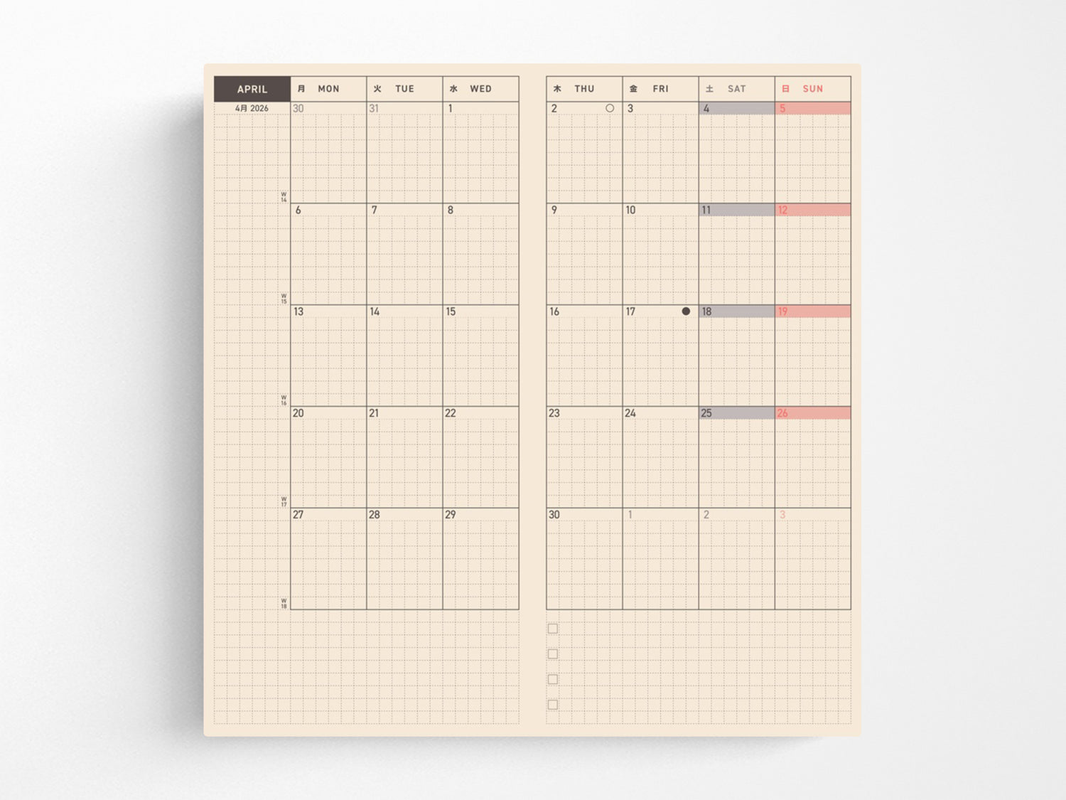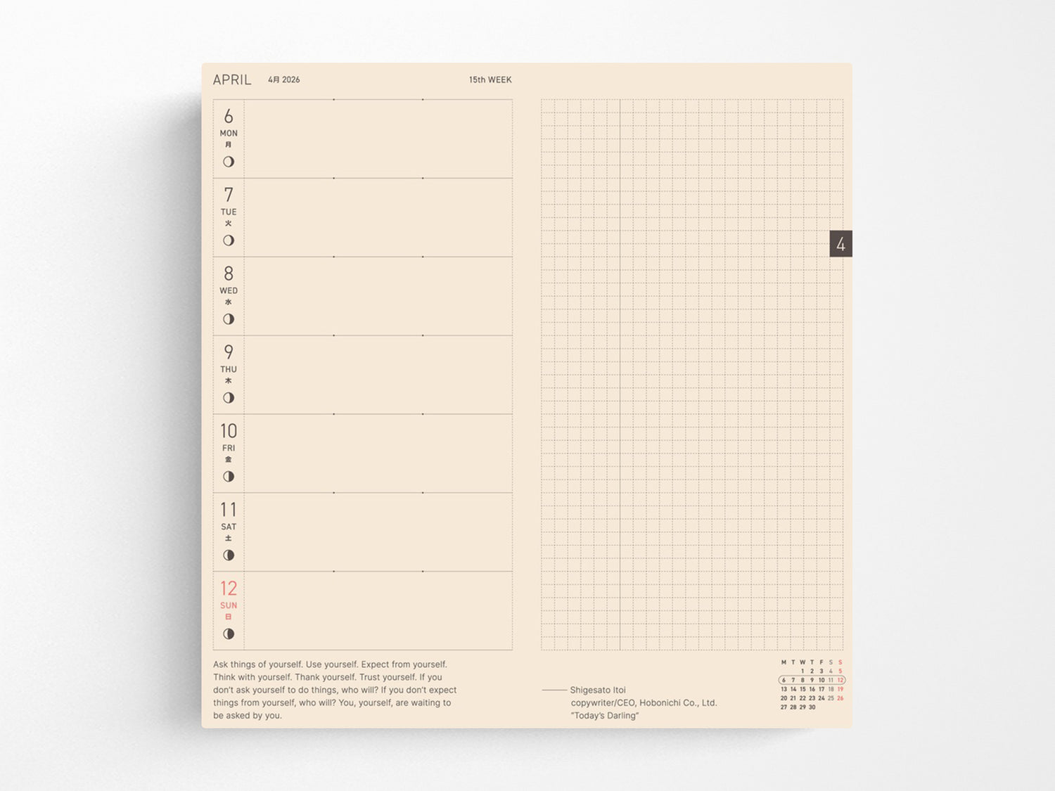 The weekly edition Hobonichi Techo is a compact book that’s easy to carry everywhere. The book is slim and roughly the size of a long wallet, making it easy to fit into a bag or suit pocket. The main layout of the book consists of a weekly calendar on the left page and blank graph paper on the right page. Each weekly spread also contains the characteristic Hobonichi quote at the bottom of the page. Although slim at first glance, the book holds plenty of graph-ruled memo pages for note-taking at the end of the book. The Weeks is available with a variety of different cover designs on the book itself and does not require an additional cover purchased separately
