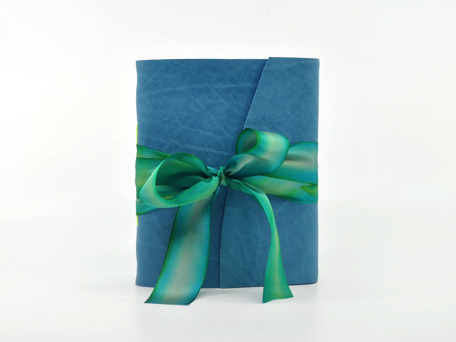 Jenni's Blue Water Lily leather journal features supple blue leather and assorted papers combined with meticulous traditional craftsmanship.