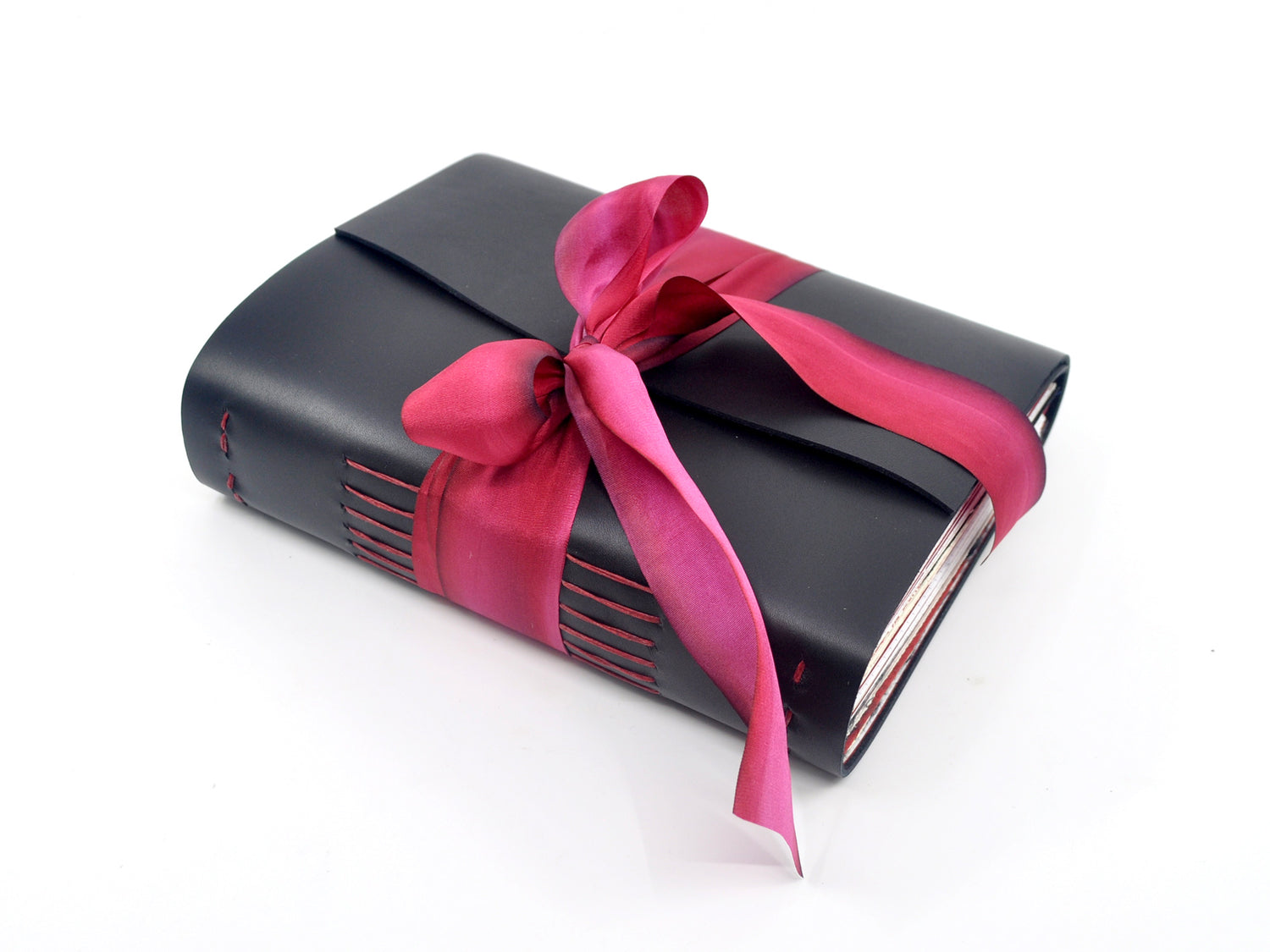 The journal is finished with a flap and a dip dyed silk ribbon that ties around the book block to hold the cover closed when you are not writing.