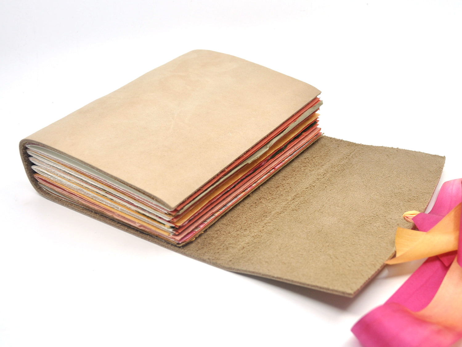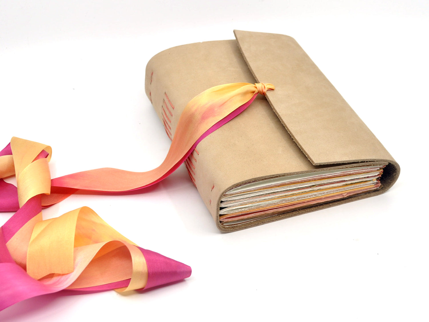 The journal is finished with a flap and a hand dyed pink and yellow ribbon that ties around the book block to hold the cover closed when you are not writing.