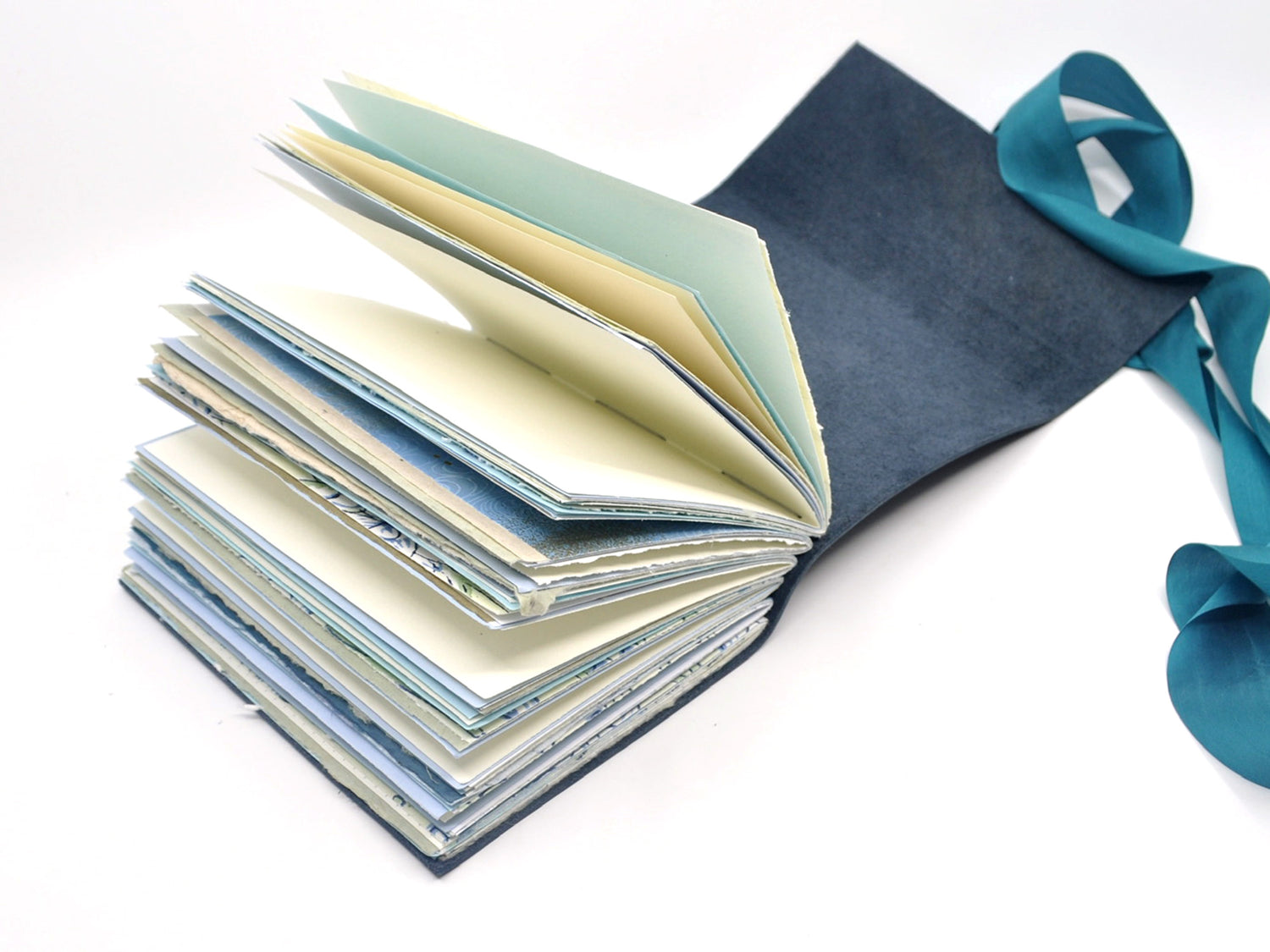 Our Summer Day journal features thick navy blue leather and assorted papers combined with meticulous craftsmanship.