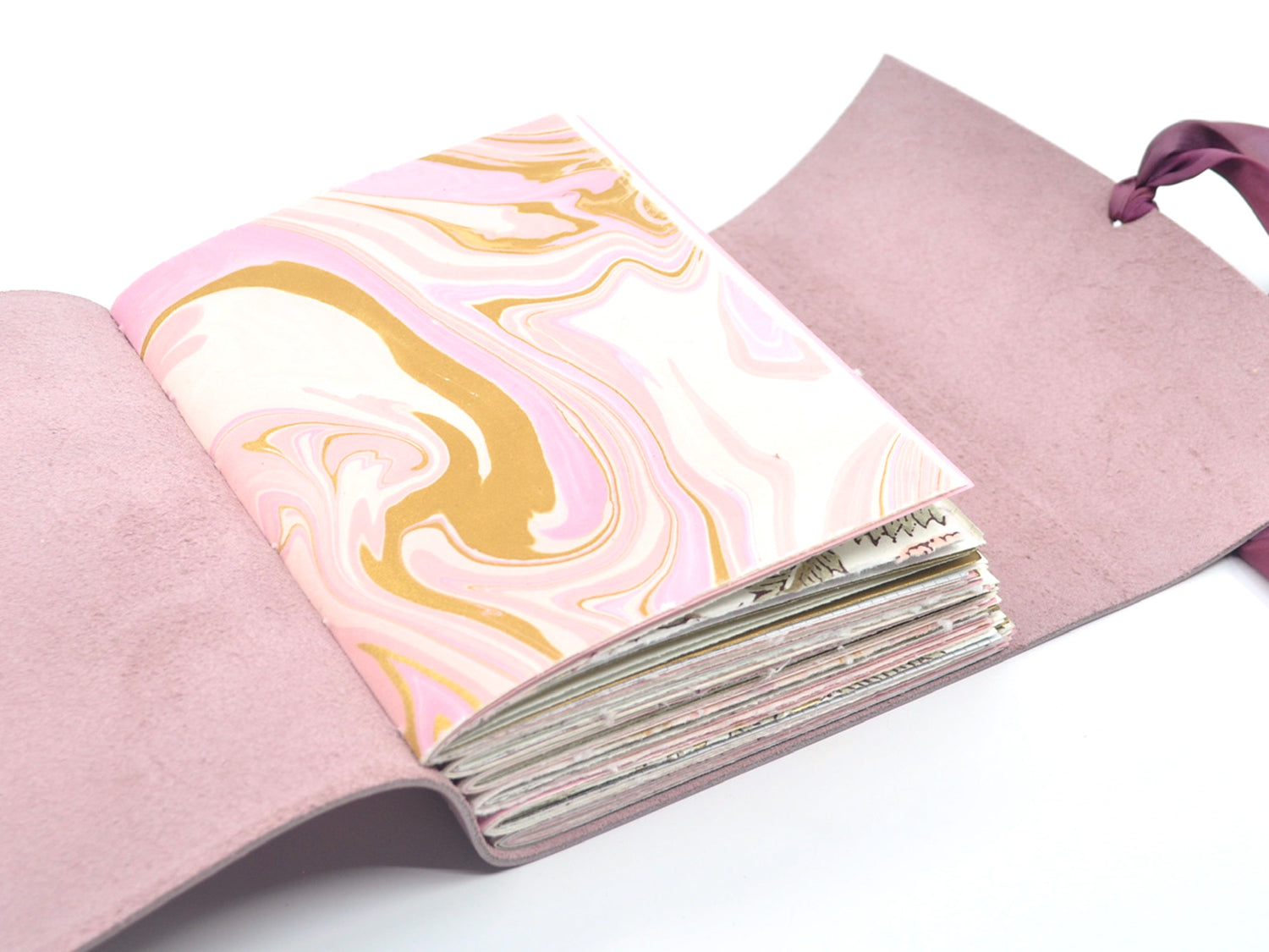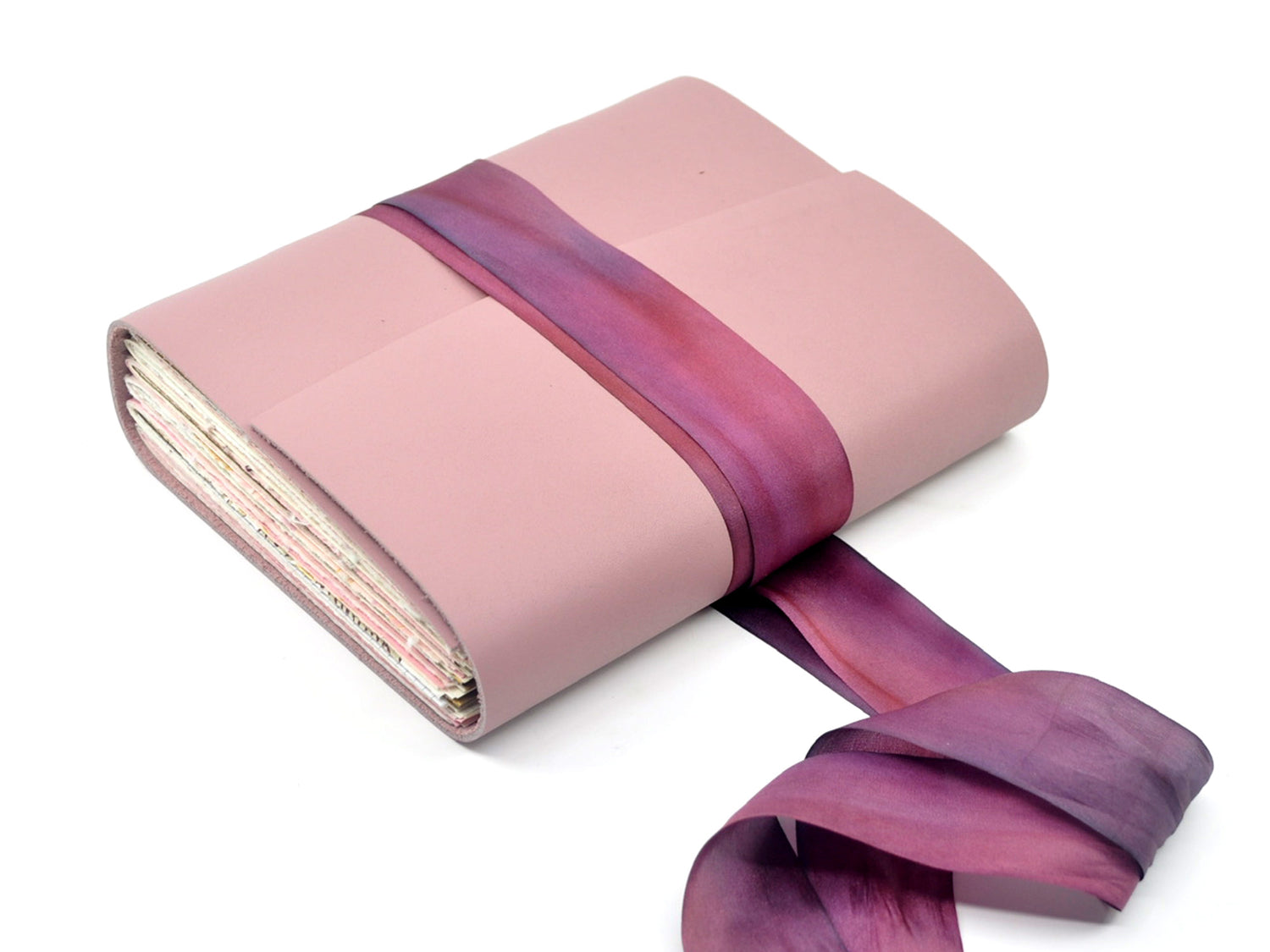 The journal is finished with a flap and a hand-dyed pink ribbon that ties around the book block to hold the cover closed when you are not writing.