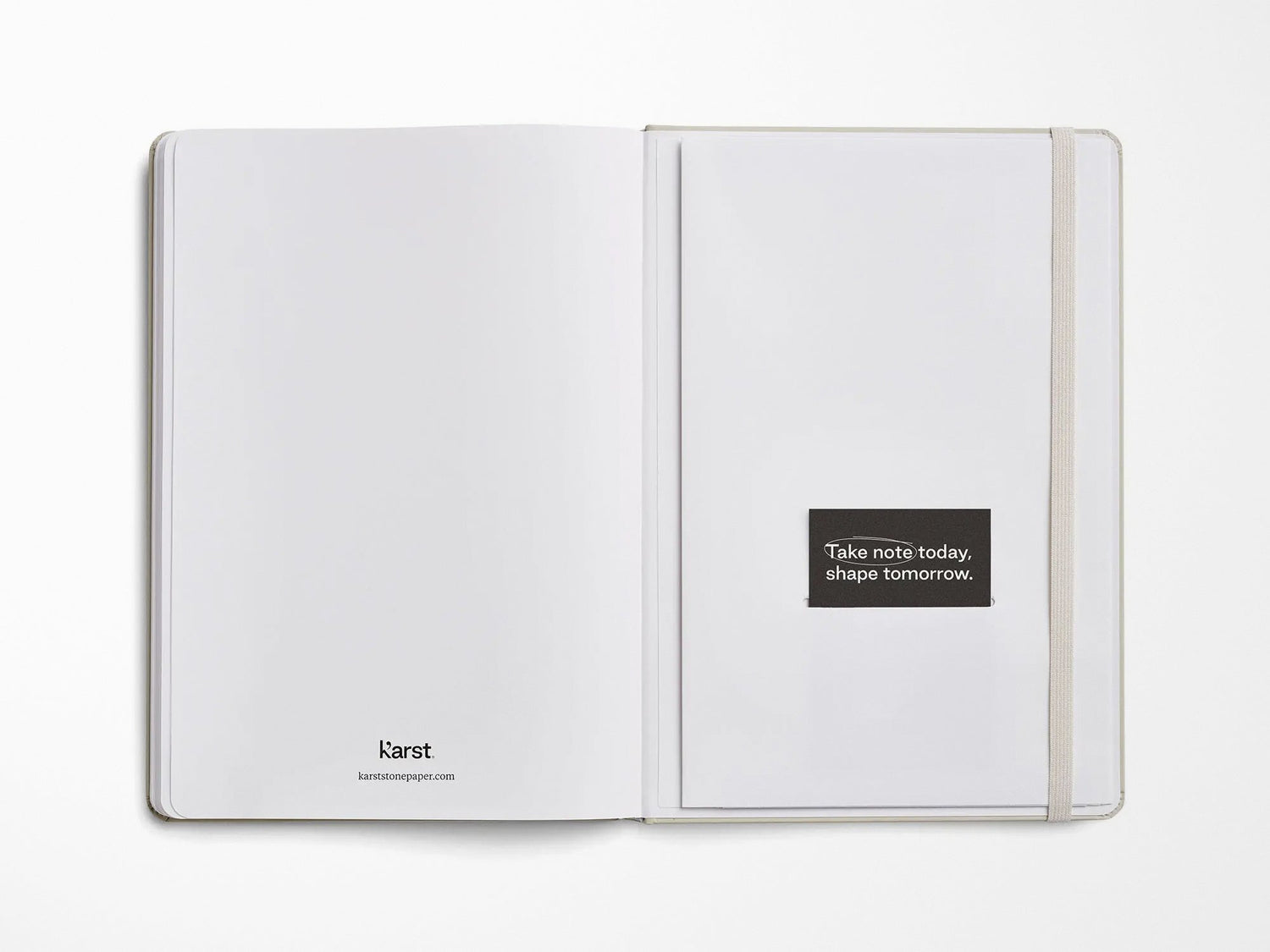 This tree-free A5 Hardcover Notebook is made from high-quality, sustainable, and recyclable stone paper. With an expandable back pocket, divider ribbon or bookmark, elastic band, and lay-flat binding.