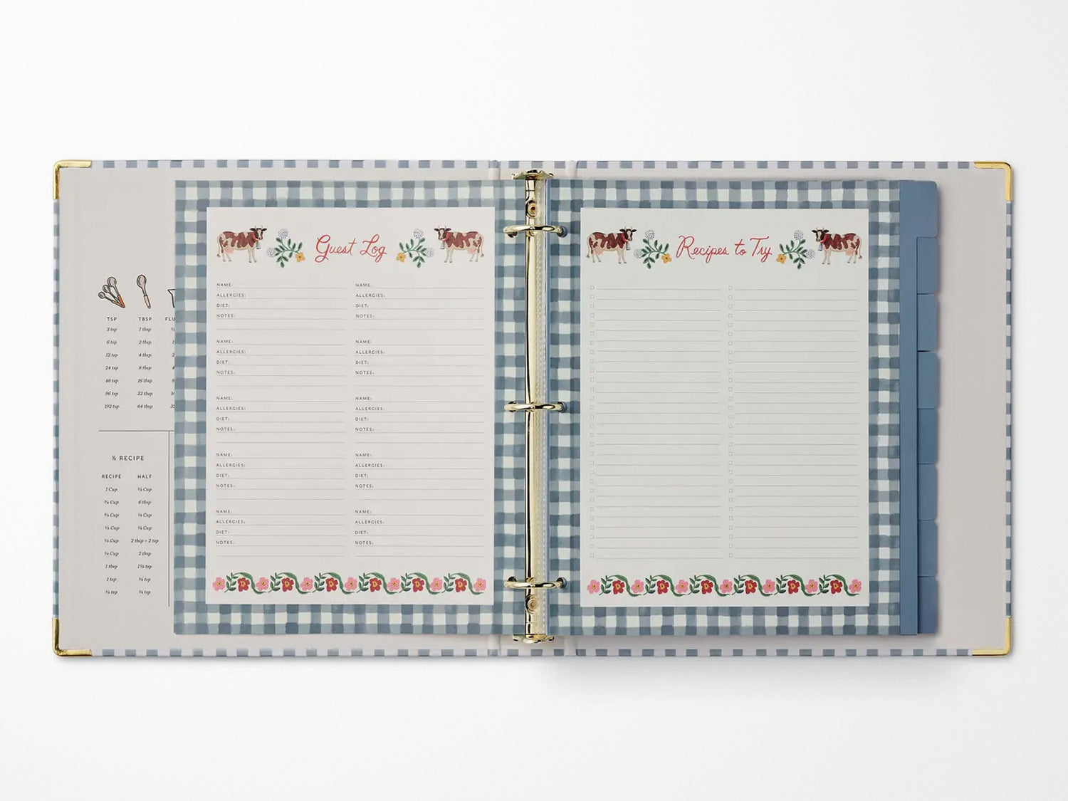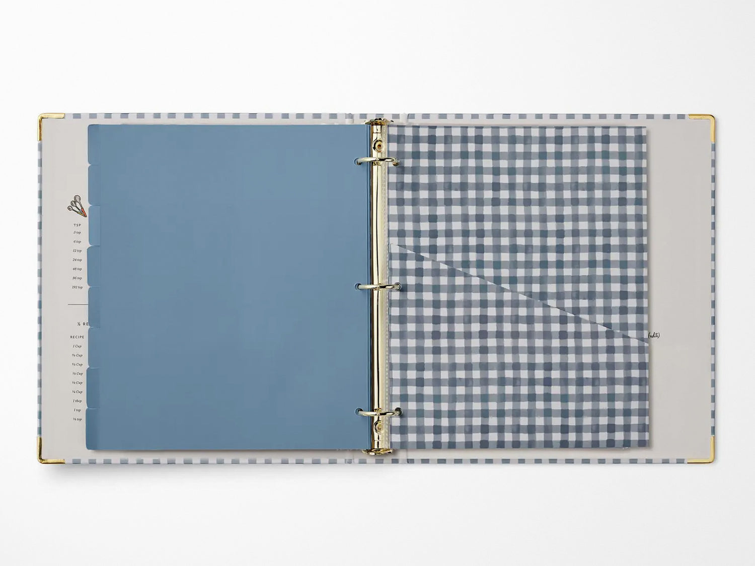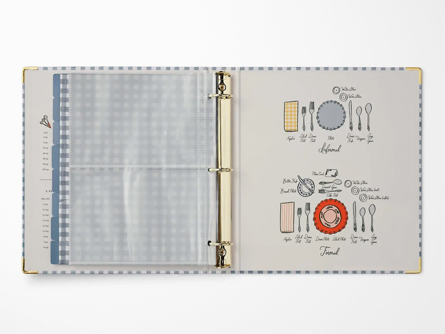 A recipe binder that’s both a resource and a keepsake. It’s a place to organize family favorites and new meals to try, complete with helpful details to keep you organized in the kitchen. The three-ring binder features gold foil accents, reinforced metal corners, a double-sided pocket folder, 16 tabbed dividers, 10 clear recipe card sleeves, adhesive labels, and illustrated reference pages.