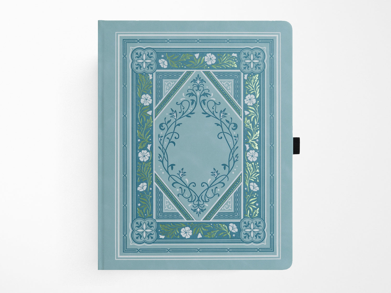 A timeless journal designed to feel like it belongs on the shelves of a grand, enchanted library. Featuring a soft blue vegan leather cover with an ornate, vintage-inspired frame design, it’s accented with delicate floral details and elegant scrollwork for a truly classic storybook look.