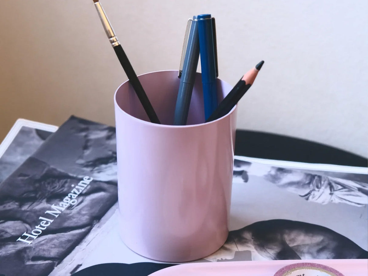 The pencil cup is made of stainless steel with a small hole in the bottom for easy cleaning.