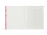 The notebook is stitched along the back so that, when open, the notebook presents a perfectly flat surface, with a seamless transition between left and right.