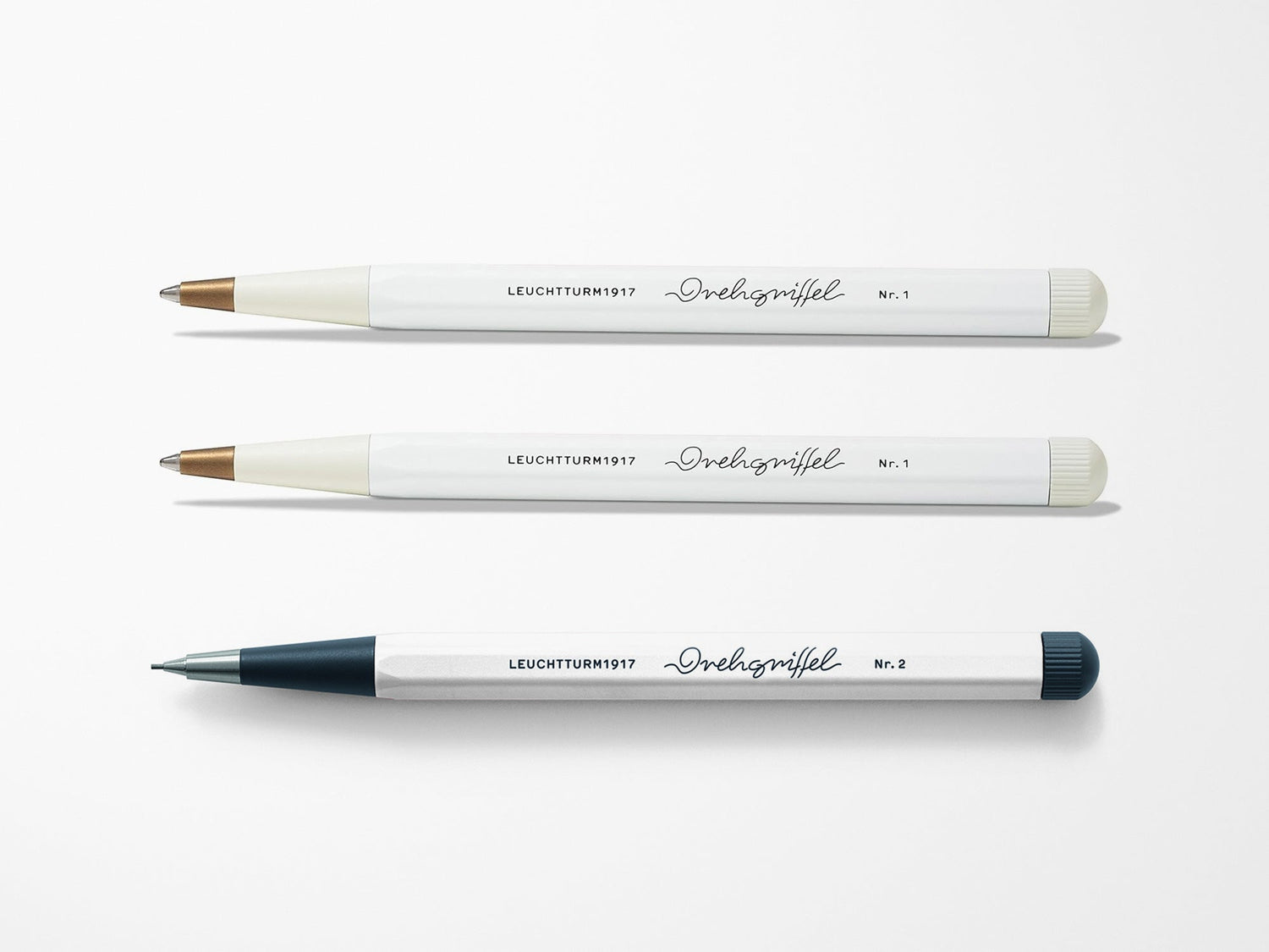 The Drehgriffel pens and pencils are made from precision-milled aluminum and brass, then painted and sealed.