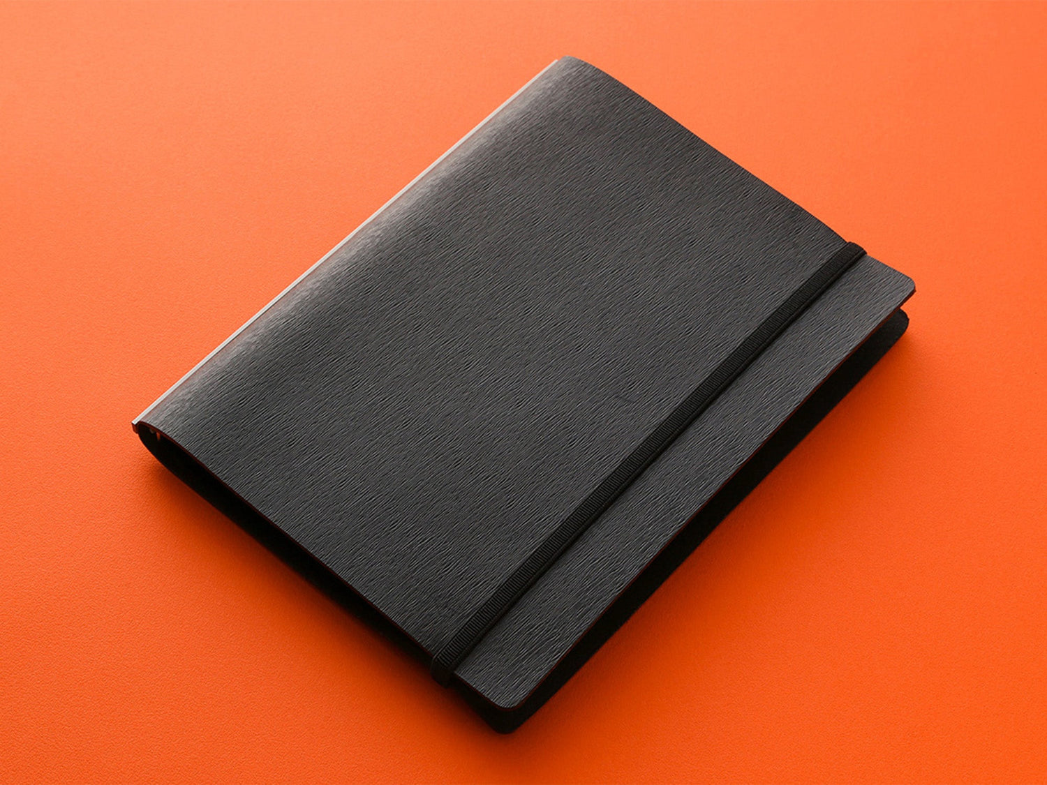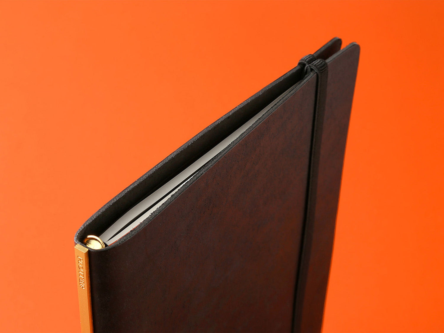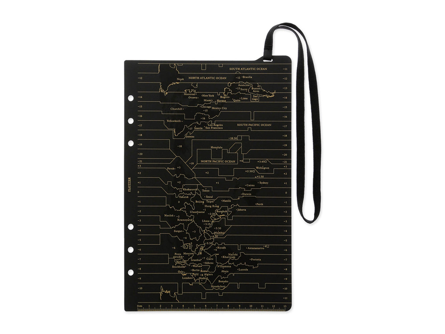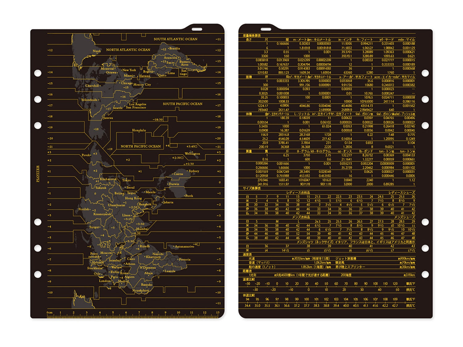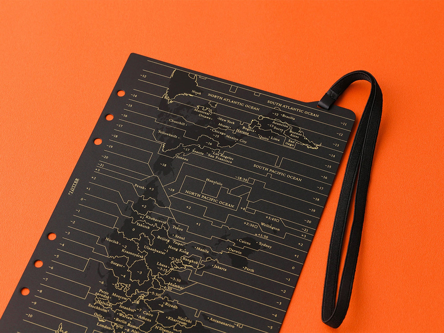 A lifter with an elastic band that securely holds the Leather Binder closed. The Lifter is designed with the world map, time difference table, and other conversion metrics, all screen printed in matte gold by hand. Enjoy the combination of functionality and design to invigorate your creative flow.