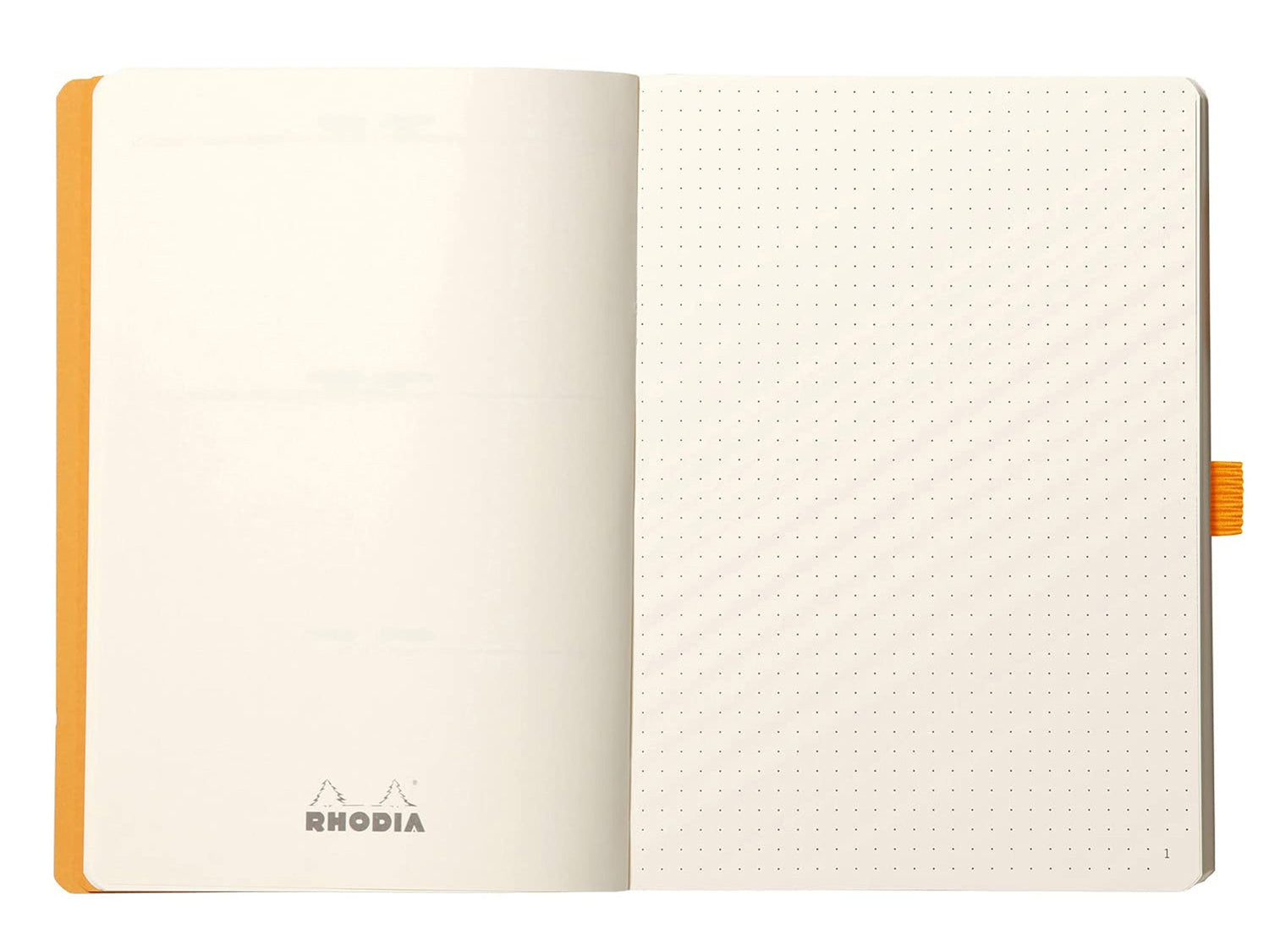 Get creative; our famous, ultra-smooth, 90g,french-milled paper is fountain pen and marker friendly. 224 numbered pages in a light ivory color with a 5mm dot grid. Includes 6-page table of contents, undated annual and monthly calendars, 2 orange ribbon markers, expanding inner pocket and a soft, supple cover