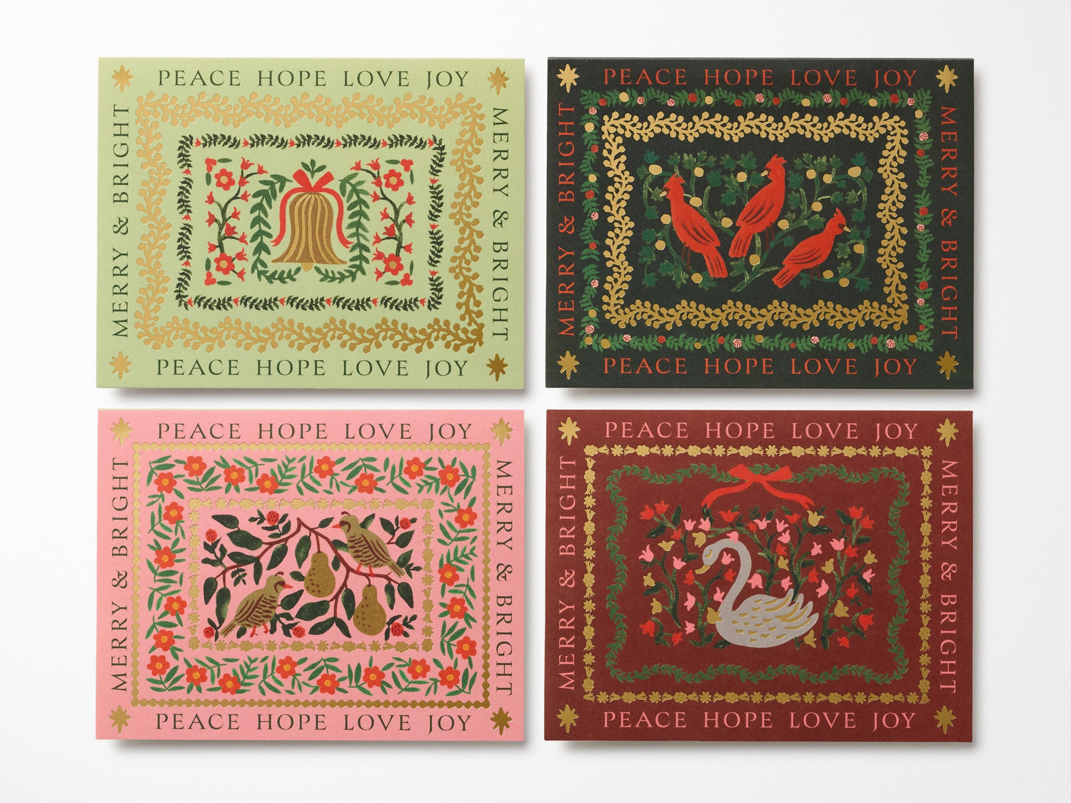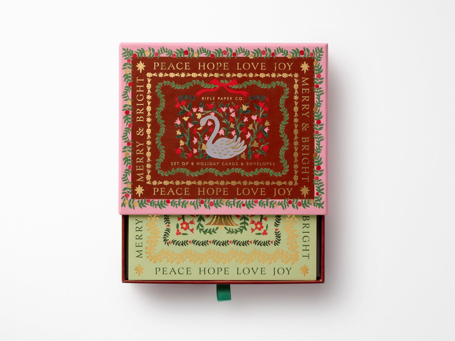 Always have a holiday card on hand with our Christmastide Keepsake Card Box. The illustrated box and pull-out tray are printed with our intricate Christmastide pattern and accented in gold. The assorted set of eight cards includes two of each festive design.