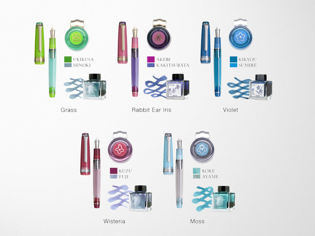 The fountain pen is sold as a set that includes a matching 50ml bottle of Sailor Manyo Sumire ink to match, as well as a cartridge converter.