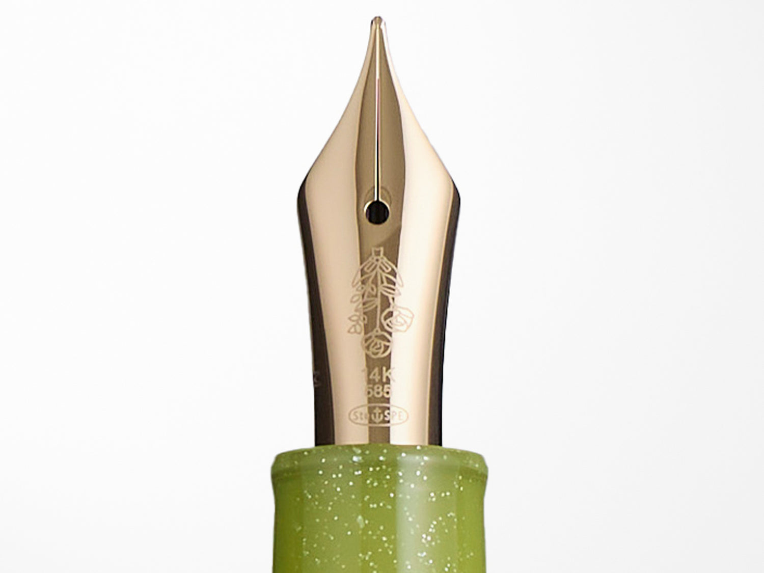 The nostalgic allure of antiqued gold-plated trim meets the elegance of a 14k gold nib, adorned with a delicate floral bouquet engraving. Offered in fine, medium-fine, and medium, these pens promise the unparalleled writing experience that only Sailor can provide.