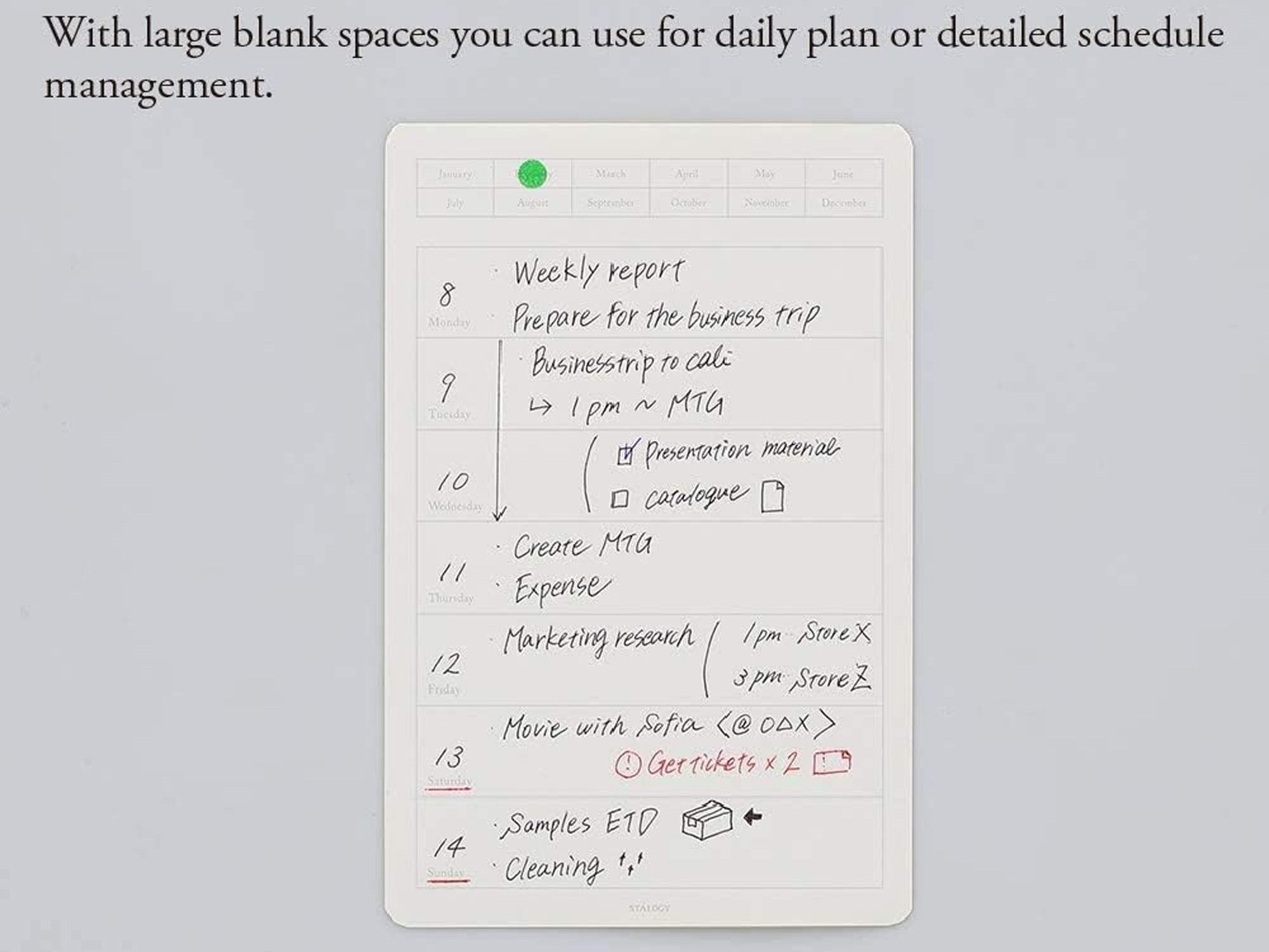 The Stalogy Diary Sticker set allows you to use any notebook as a planner. Simply peel and stick the weekly planning layout sticker and add a useful planning tool to your plain pages. Works with any size notebook.