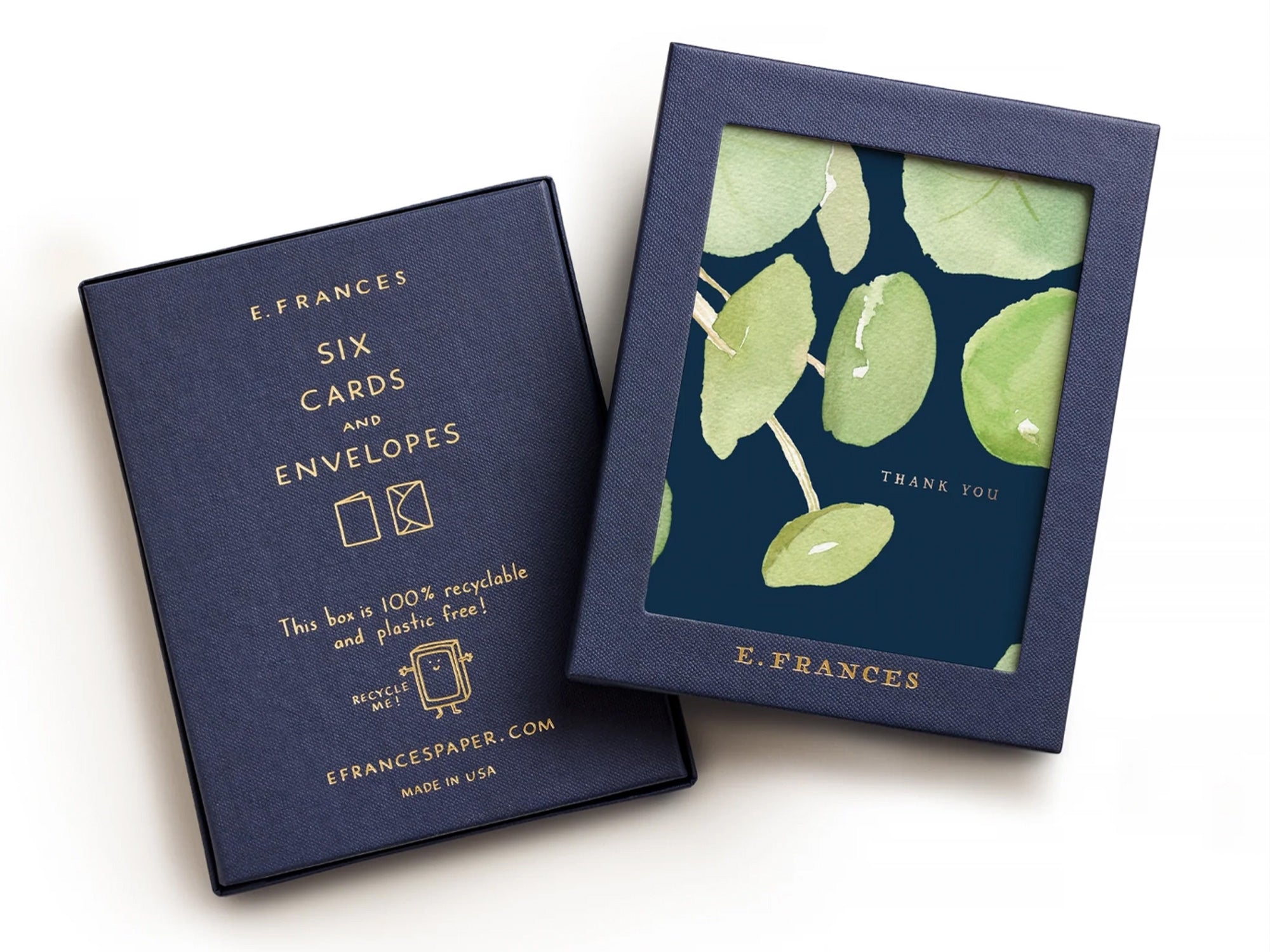 Each E. Frances card begins as an original watercolor painting, is then printed in brilliant color on luxe, heavyweight paper and is finally kissed with gold foil.